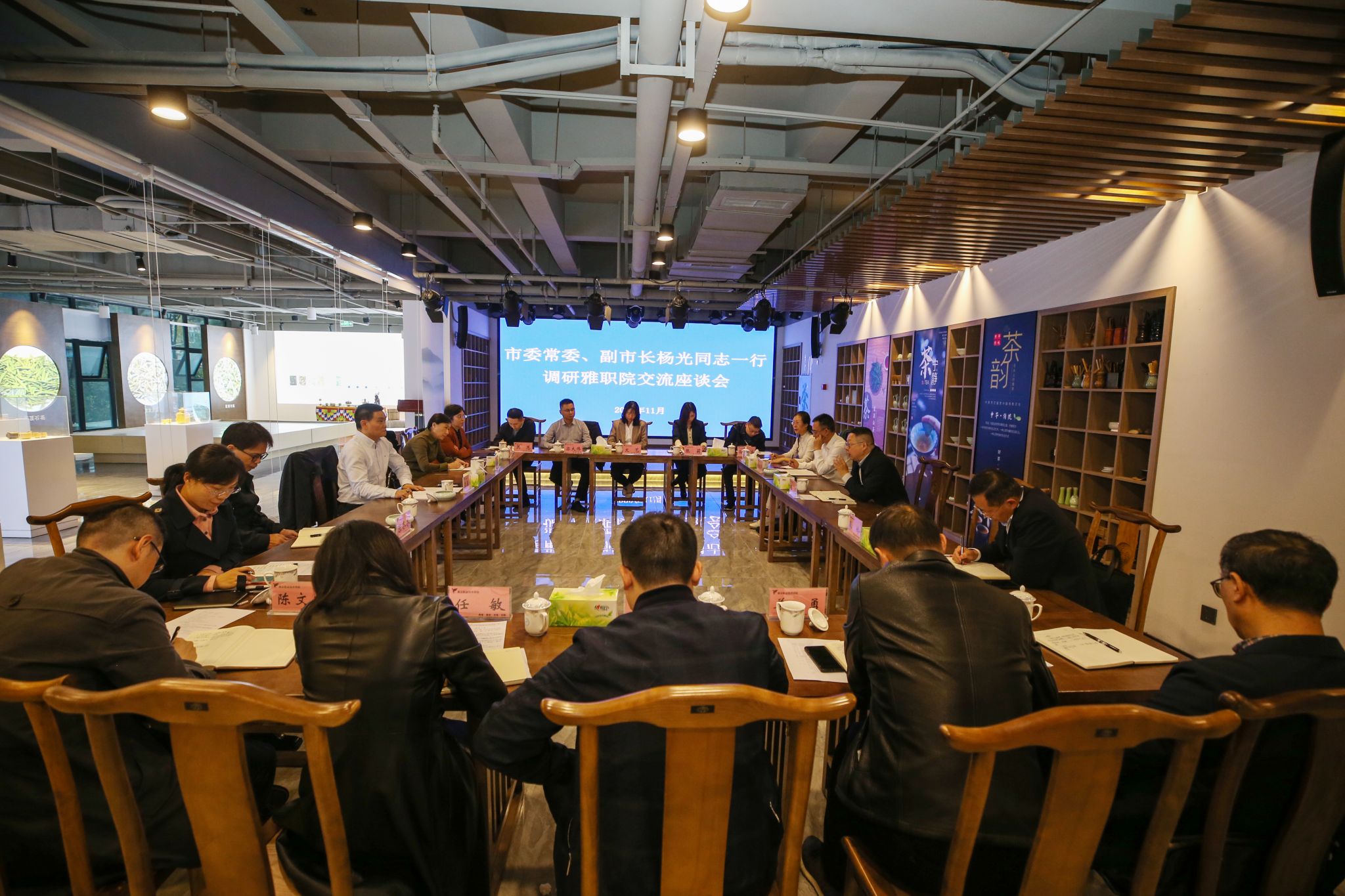 杨光一行参观了经济与管理学院智慧文旅实训基地、中西餐实训室、电商直播实训基地、茶创空间等实验实训教学场所,听取了学院经济与管理学院近几年在人才培养、科学研究、社会服务、文化传承与创新、国际交流与合作五个方面的工作汇报。