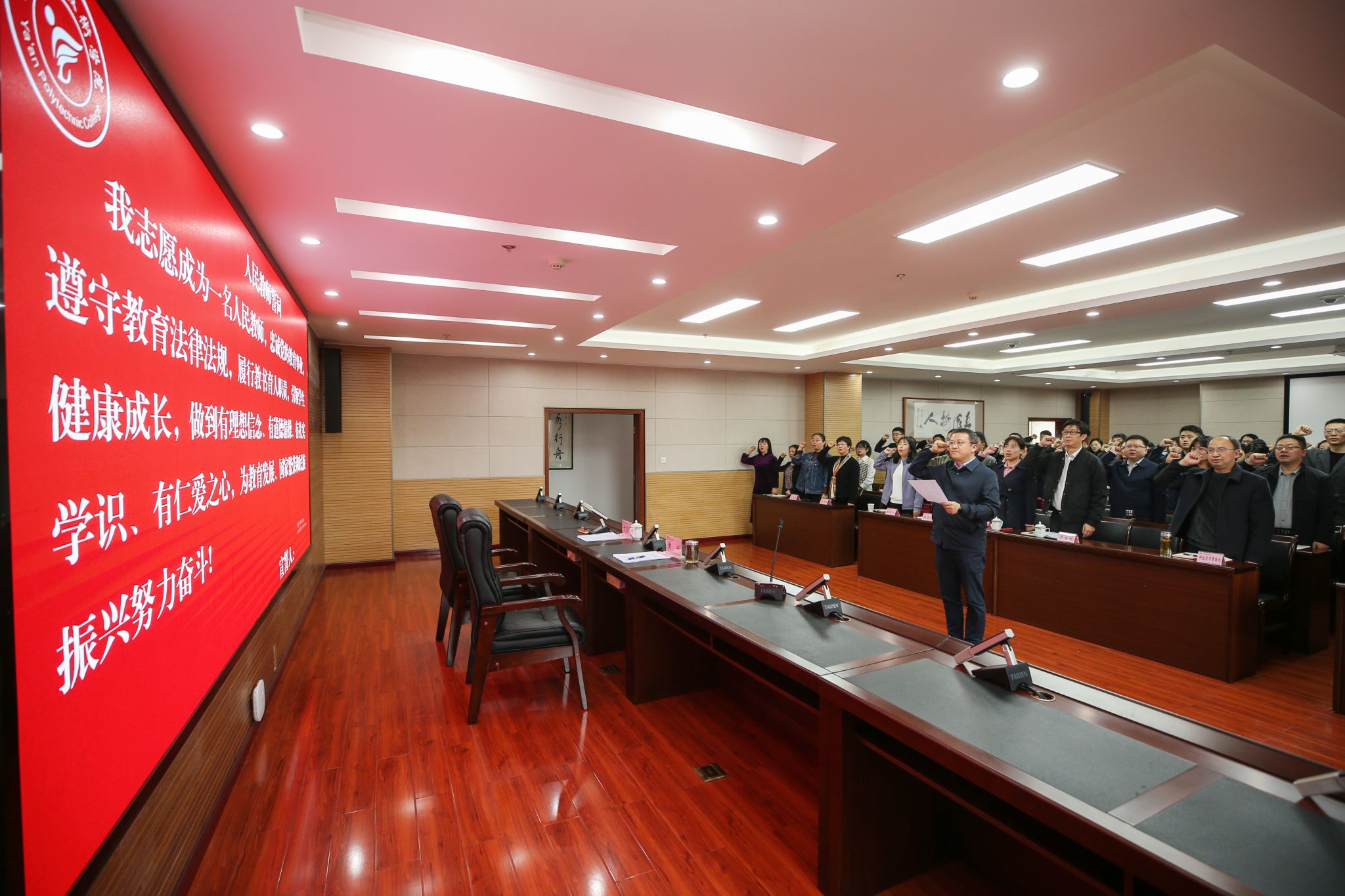 黄诚带领全体新教师进行入职宣誓,代表学院党委向新入职的教师表示热烈欢迎和诚挚问候,并对学院的办学历史、发展现状及未来规划进行了介绍,从对生活事业充满正能量、正确认识教师职业定位、踏实做好职业生涯规划、远离红线坚定职业操守四个方面与新入职教师进行交流,对参加培训的青年教师提出殷切期望。