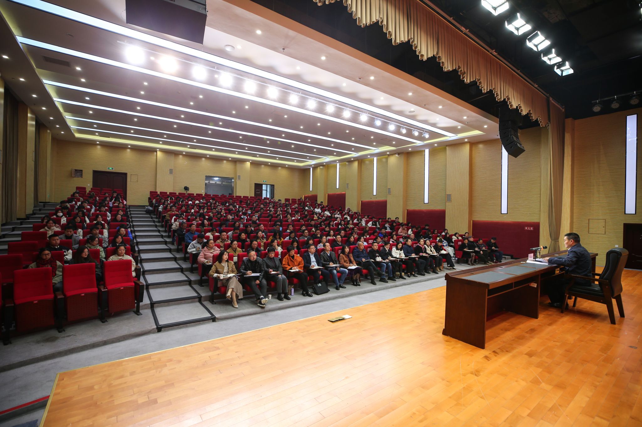 11月14日下午,学院党委书记李春模在经开区校区聚雅厅为学院党员干部师生讲授主题教育专题党课。省委第十一巡回督导组成员邢春城、毛胜凡到会指导。