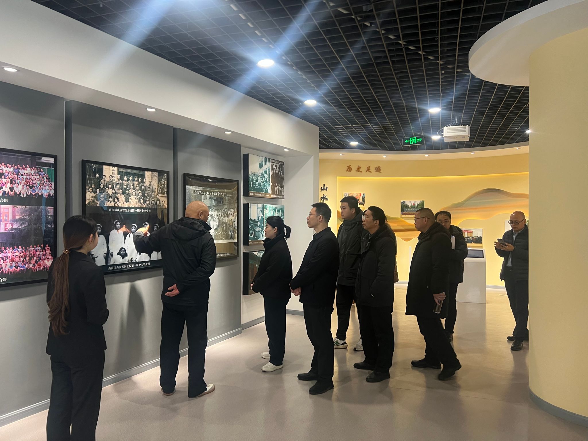 座谈会前,樊正康陪同李源彬一行参观了校史馆,向来宾介绍了学院的历史沿革、办学历程以及近年来在党的建设、人才培养、产教融合、校园文化等方面的工作。