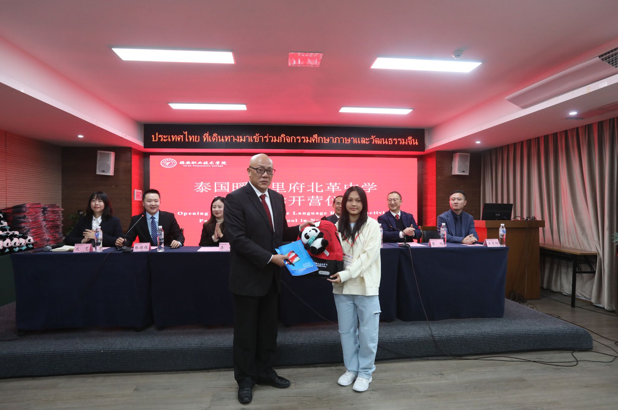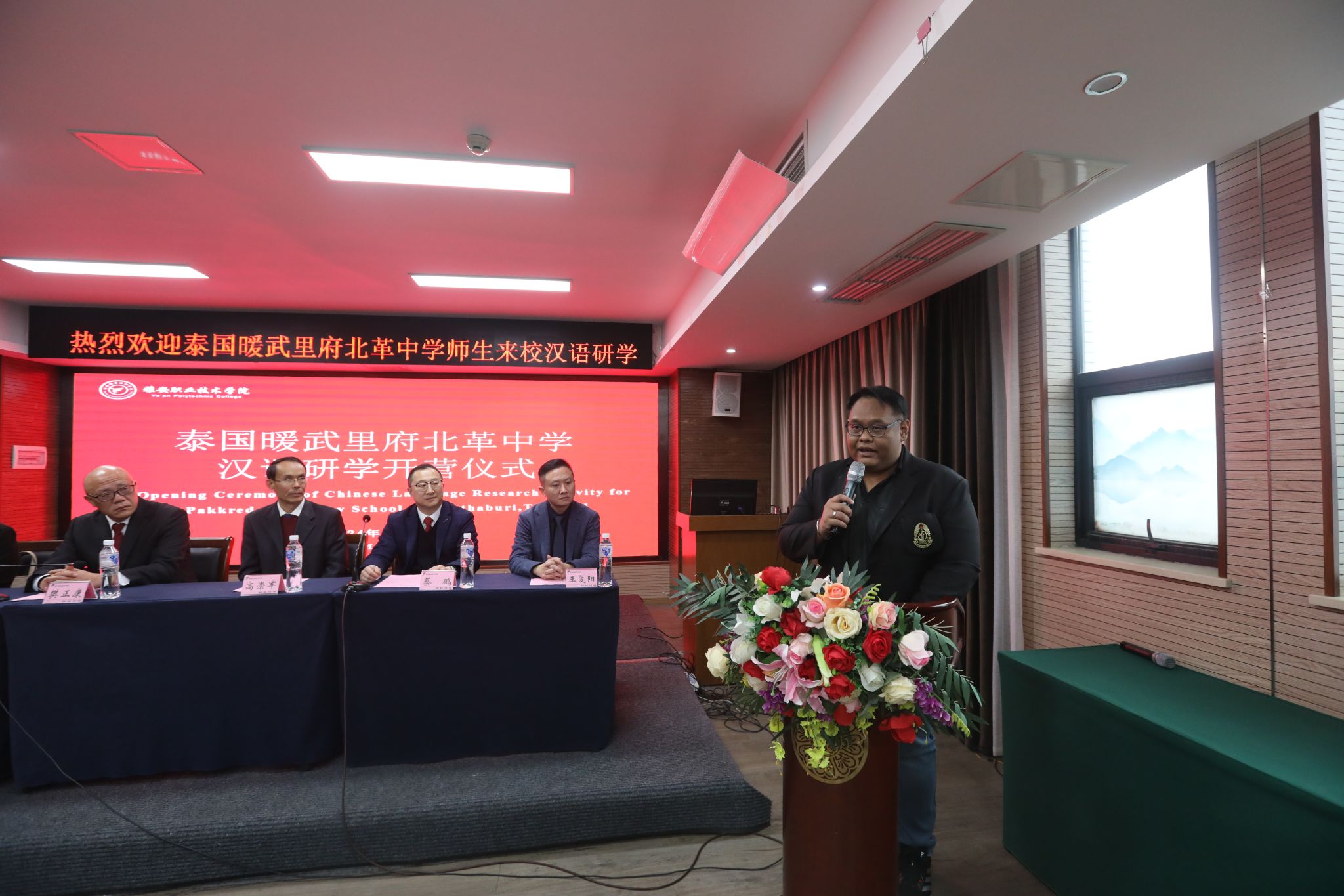 3月13日上午,学院组织开展了泰国暖武里府北革中学汉语研学夏令营开营仪式,学院党委常委、副院长樊正康,市委统战部副部长高崇军,雅安市侨联专职副主席蔡鹏,泰国朱拉隆功大学学术服务中心暖武里项目主任、汉语研学团长张德俊,学院学生处、保卫处、继续教育与国际交流处、师范学院、经济与管理学院、弘睿达资产经营管理有限公司负责人,泰国暖武里府北革中学68名师生参加了本次开营仪式。