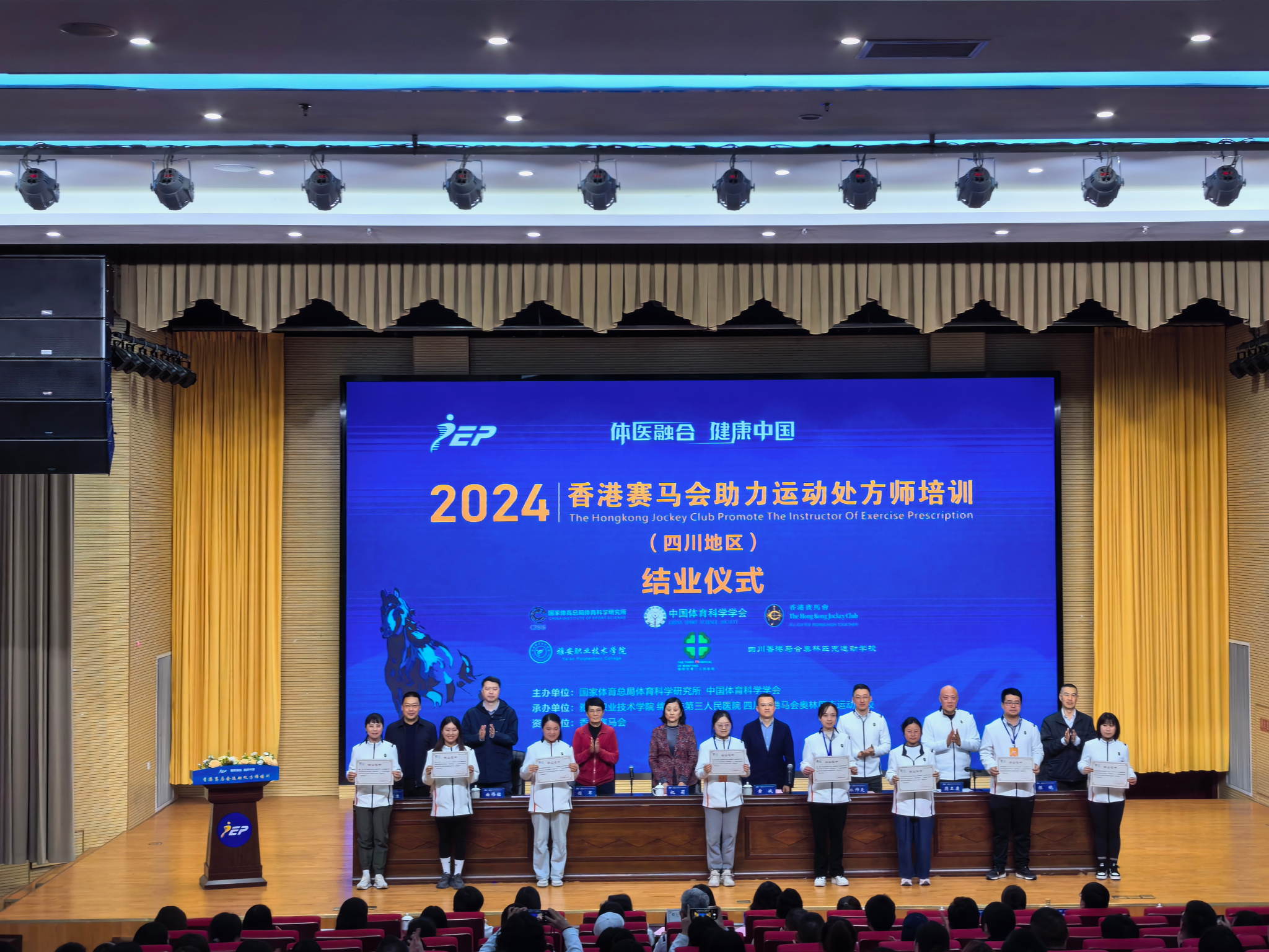 3月26日,由中国体育科学学会、国家体育总局体育科学研究所主办,beat365英国官方网站、雅安市文化体育和旅游局承办,香港赛马会资助的2024香港赛马会助力运动处方师培训(雅安地区)在学院经开区校区聚雅厅举行结业仪式。学院党委副书记、院长黄诚,中国体育科学学会常务理事、战略规划办公室主任、期刊工作委员会主任委员祝莉,香港赛马会国内体育项目主任顾问任军,国家体育总局政府网站采编部主任贾海红,国家体育总局体育科学研究所科技成果转化处处长曲伟铭,绵阳市第三人民医院党委书记王继生,四川香港马会奥林匹克运动学校校长陈晓出席结业式。学院党委常委、副院长樊正康主持结业式。