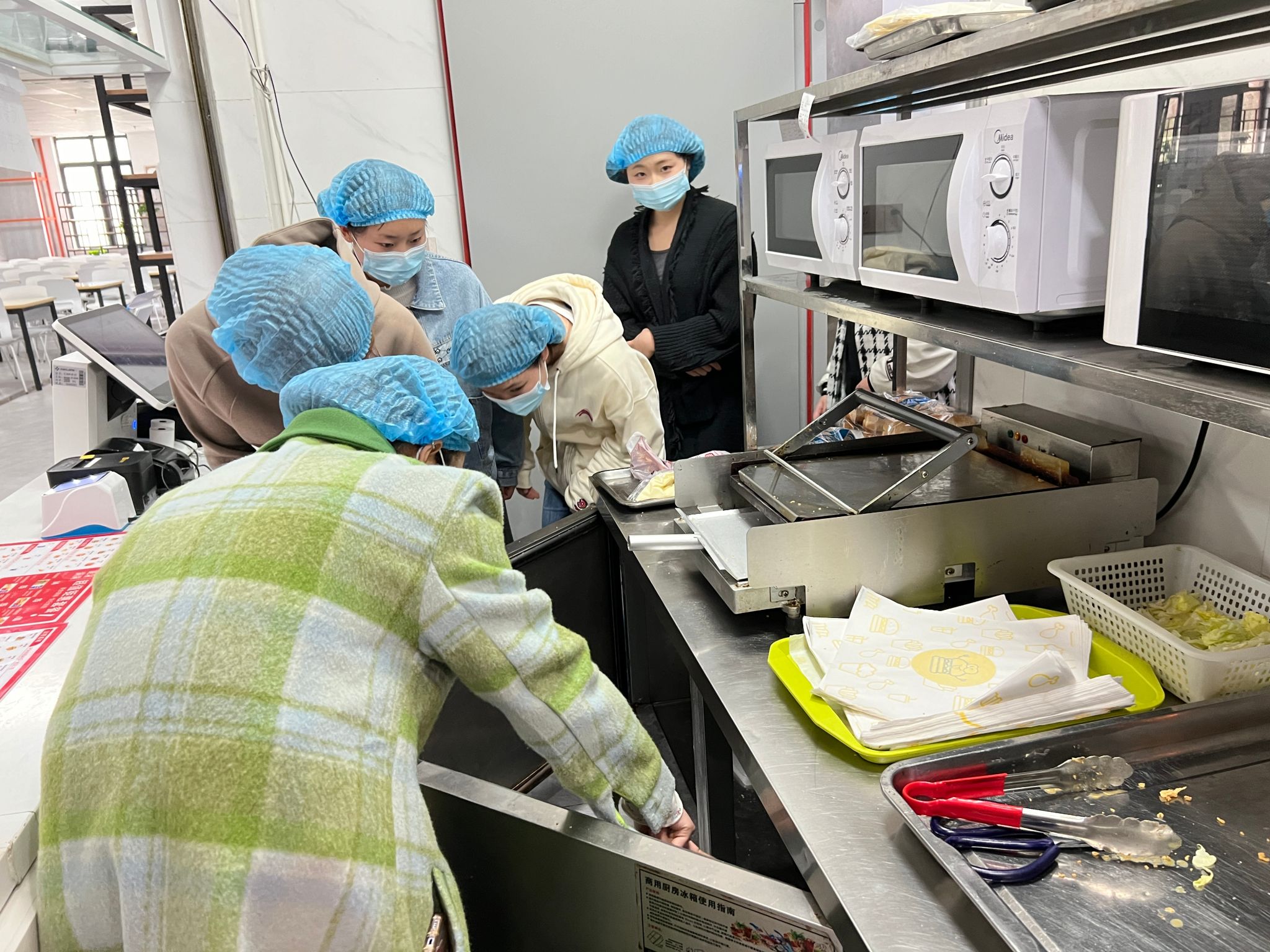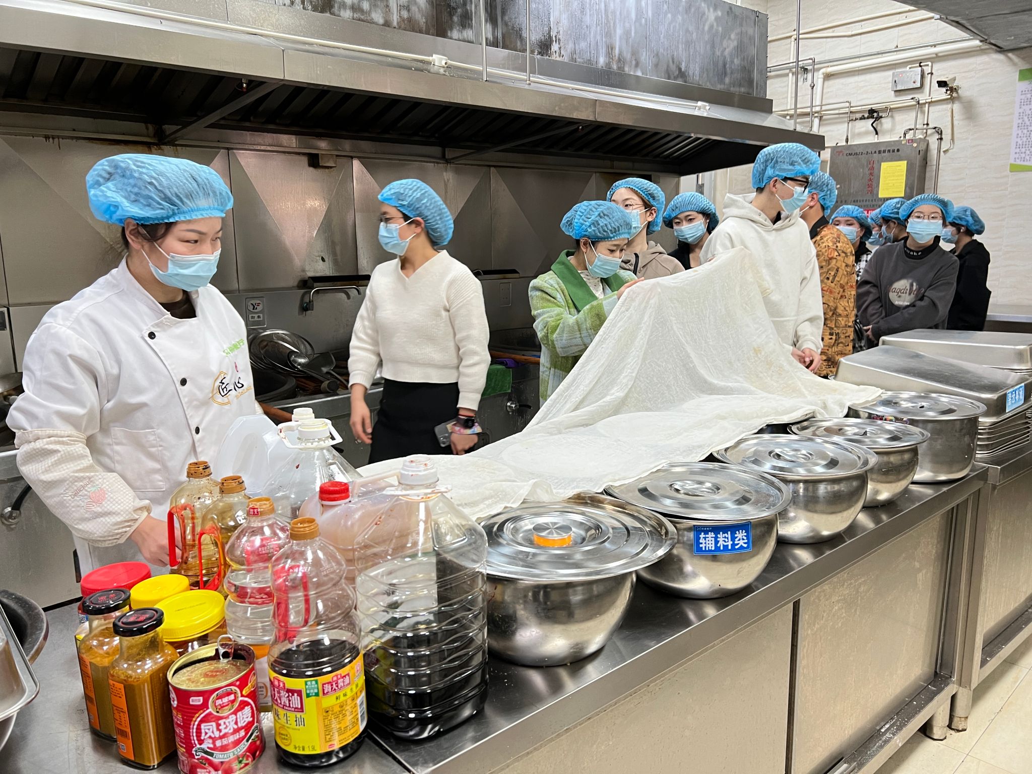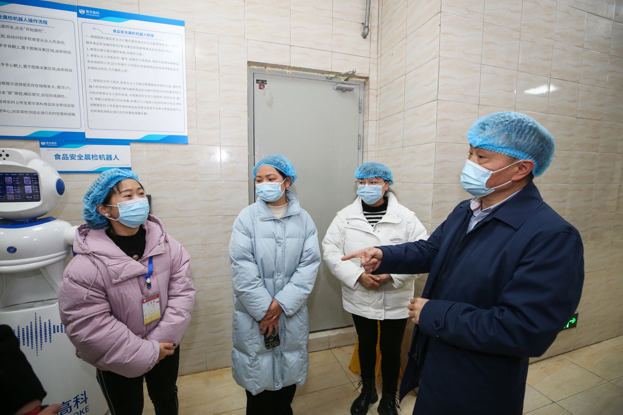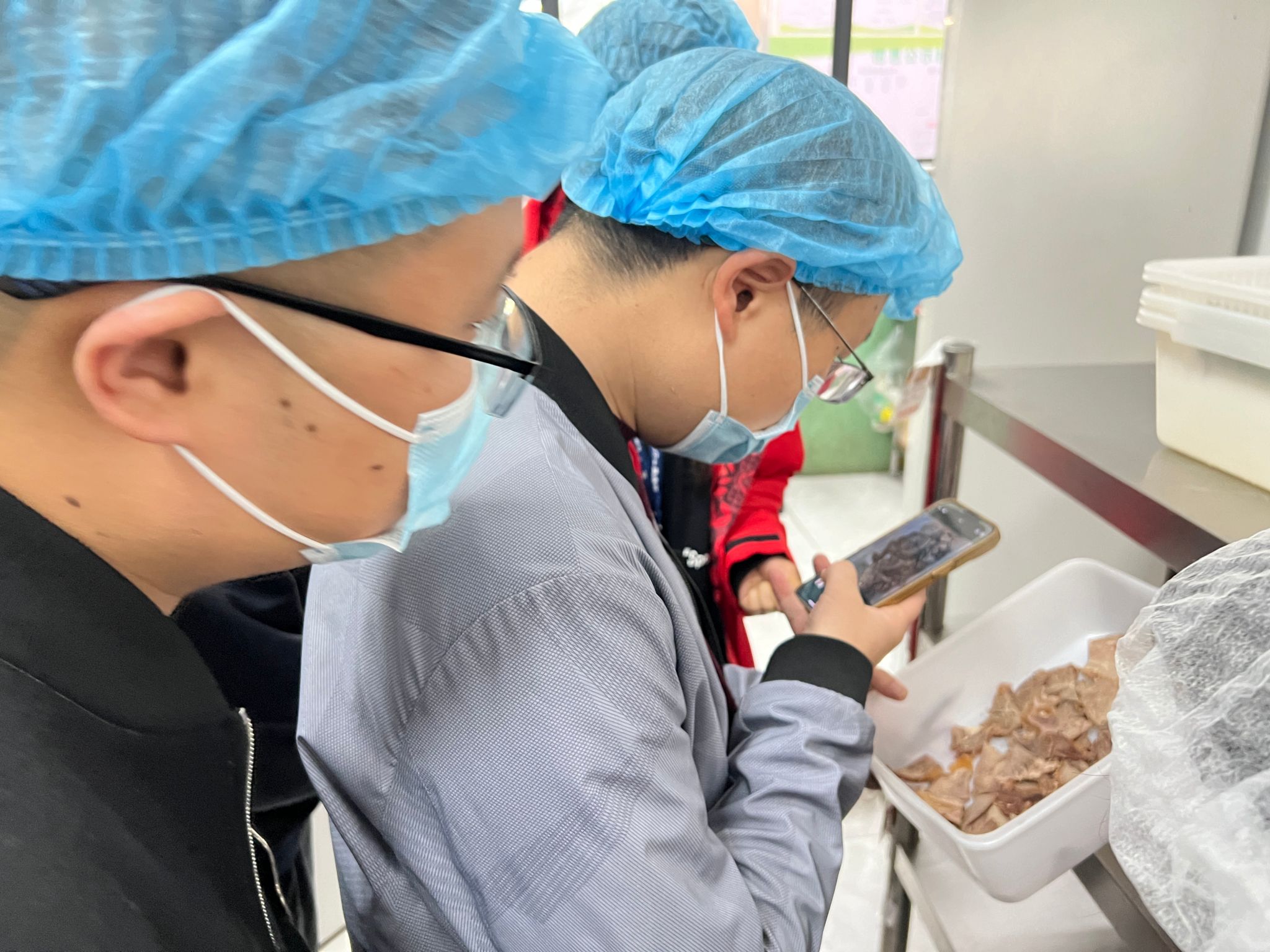守牢“四道关卡”。一是守牢从业人员健康关。学院所有食品从业人员必须持有效的健康证明方可上岗,建立了详细的员工健康档案,实现一人一档。二是守牢食材入口关。建立了严格的食品采购制度,米、面、油、猪肉等大宗食材均通过第三方代理机构公开招标确定供货商,并严格执行进货查验制度、索证索票制度等相关要求,确保食材来源的安全与可控。三是守牢食品加工关。严格遵守食品加工操作规范,禁止食材加工场所、盛装容器、加工设备及水池等设施设备混用,从源头杜绝食品交叉污染;菜品加工严格按照洗、切、配、烹流程,确保食材安全可控;严格执行食品留样制度,确保每个菜品留样重量、留样时间符合要求;加强对食品加工场所卫生管理,定期清洁食品处理区设施、设备。四是守牢食品储存关。建立了科学的食品储存制度,食品库房具备了良好的通风、防潮、防鼠等设施;主、副食品分库贮存,确保专库专用;食品存放分类、分架、隔墙、离地,并设置明显的标识;确保食品在储存过程中不受污染和变质,从而有效保障食品安全。驻场食品安全员每日对从业人员健康情况及食材验收、食品加工流程、场所卫生进行检查,发现问题及时整改,降低食品安全风险隐患。