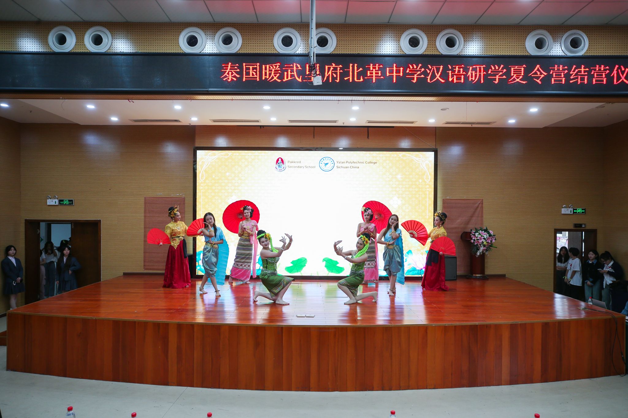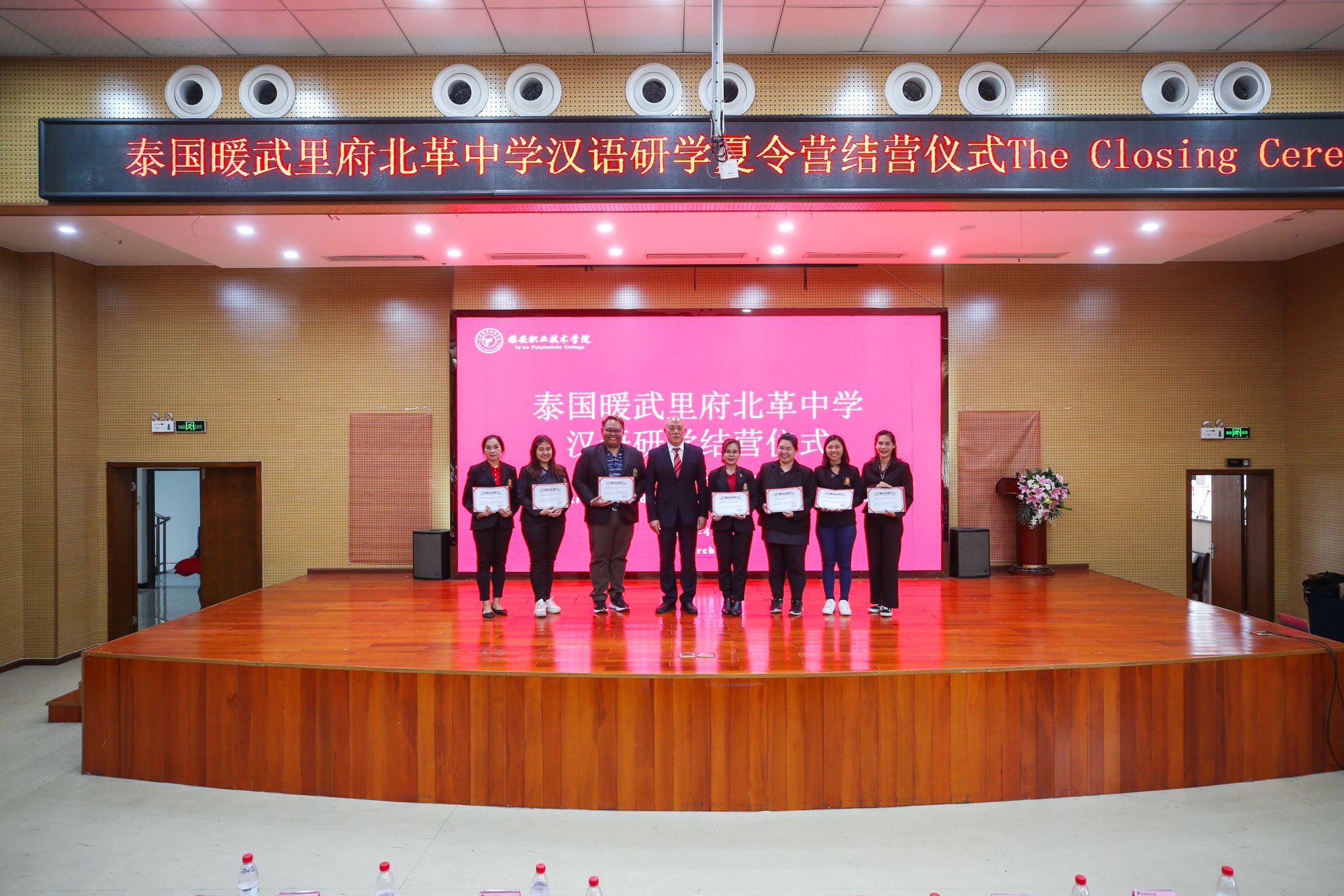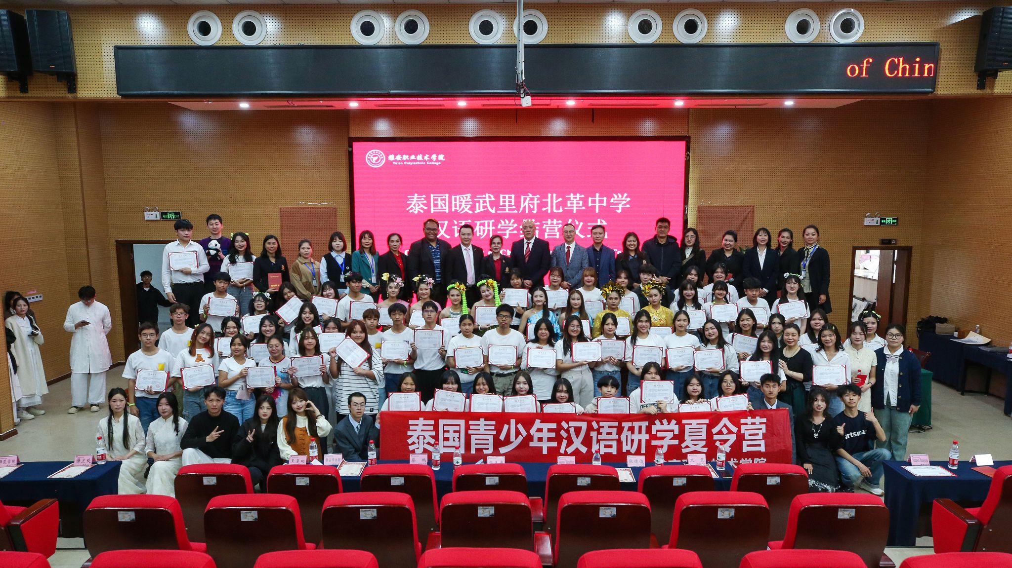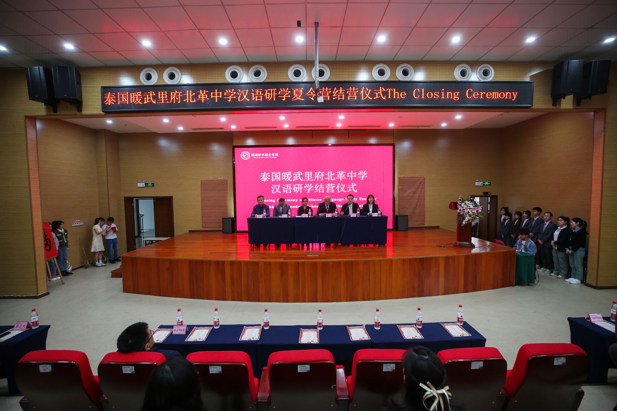 4月7日下午,泰国暖武里府北革中学汉语研学夏令营结营仪式在学校青年路校区举行。学校党委常委、副校长樊正康,雅安市侨联专职副主席蔡鹏,泰国暖武里府北革中学校长棱洛伊•彭潘(Nangnoi Bhengbhun),泰国朱拉隆功大学学术服务中心暖武里项目主任、汉语研学团长张德俊,学校保卫处、继续教育与国际交流处、师范学院、经济与管理学院、弘睿达资产公司的负责人,授课教师代表及泰国暖武里府北革中学70名师生参加了本次结营仪式,结营仪式由继续教育与国际交流处副处长文艺主持。