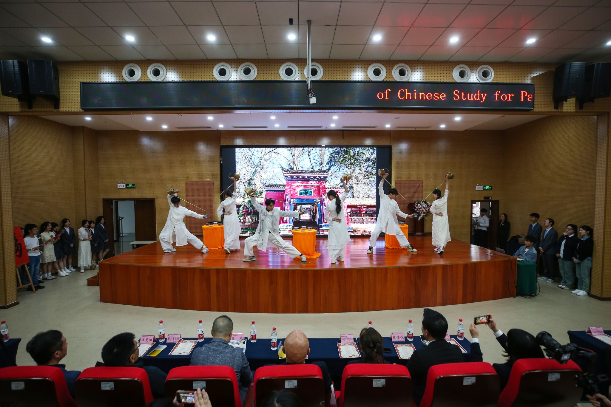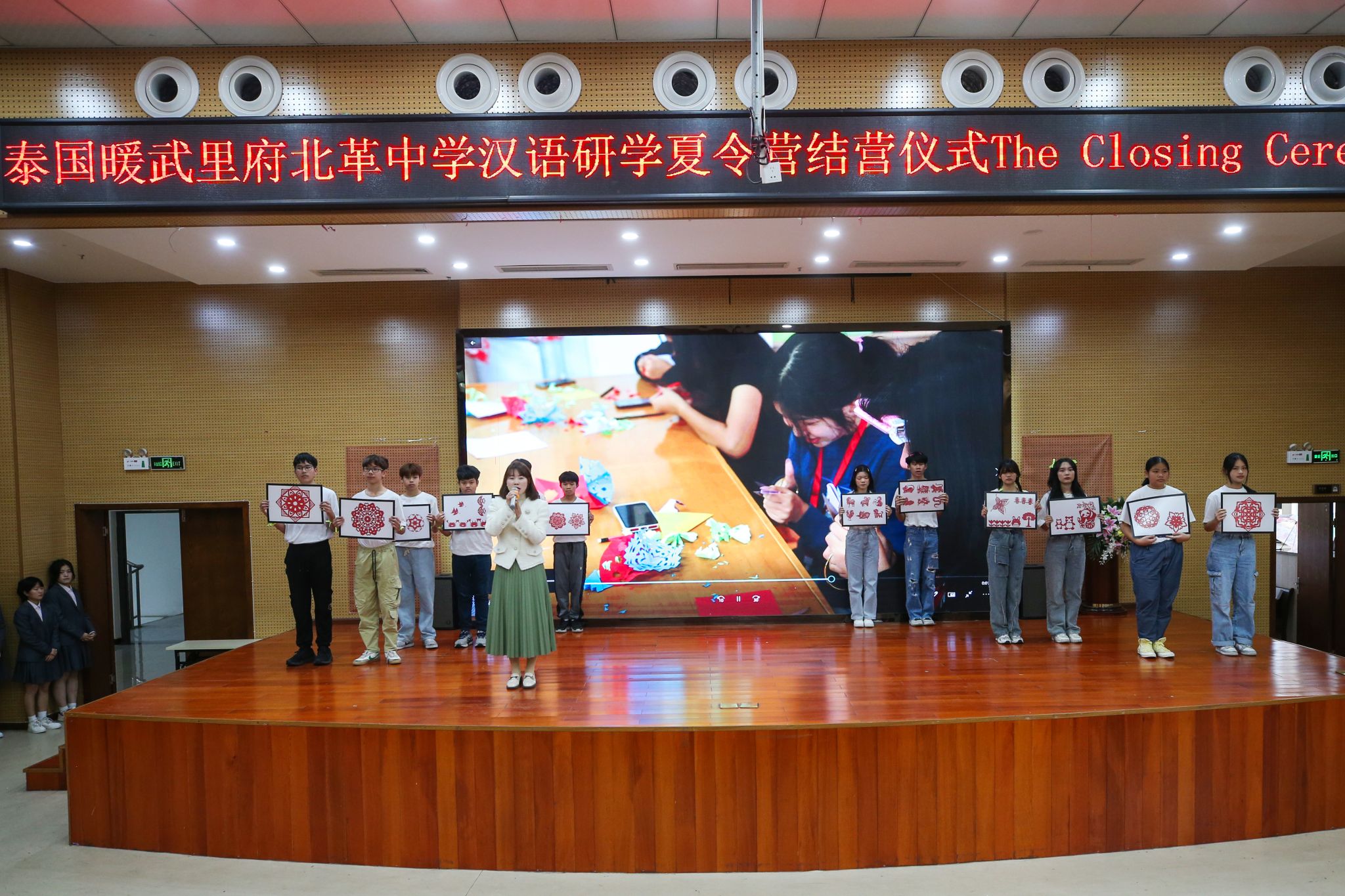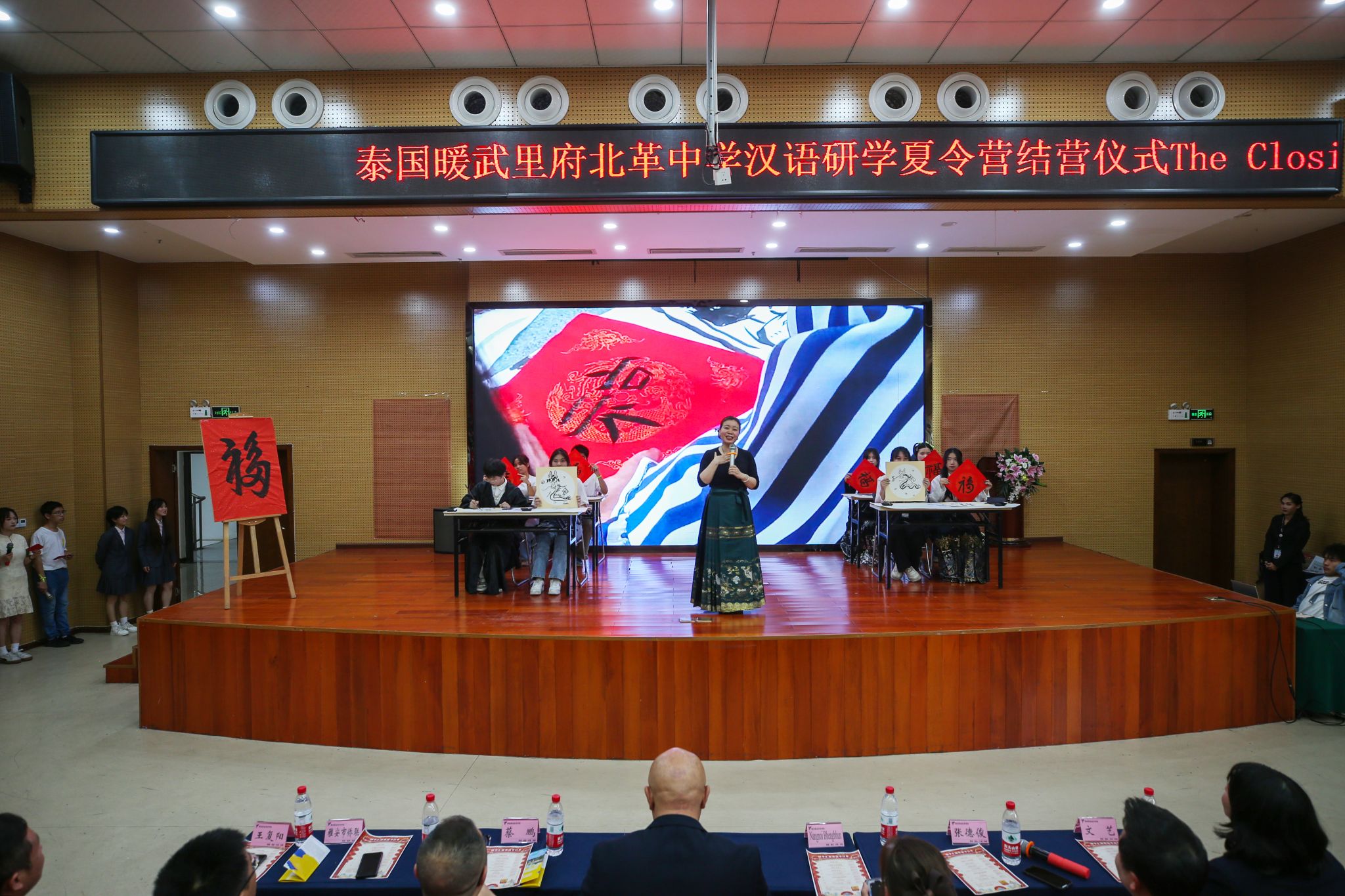 随后,精彩的研学成果汇报演出拉开帷幕。中国学生的长嘴壶表演为演出揭开序幕,泰国学生的中文朗诵《水调歌头》、中文歌曲联唱、中国剪纸和中国画学习成果展示,以及泰国歌舞交流等节目,将现场气氛推向高潮。中泰学生同台展示的“龙兴福到”书法创意和摸福字节目更是将演出推向顶点。最后,在全体中泰师生共同合唱的“It’s time to say goodbye”中,本次研学夏令营圆满落幕。