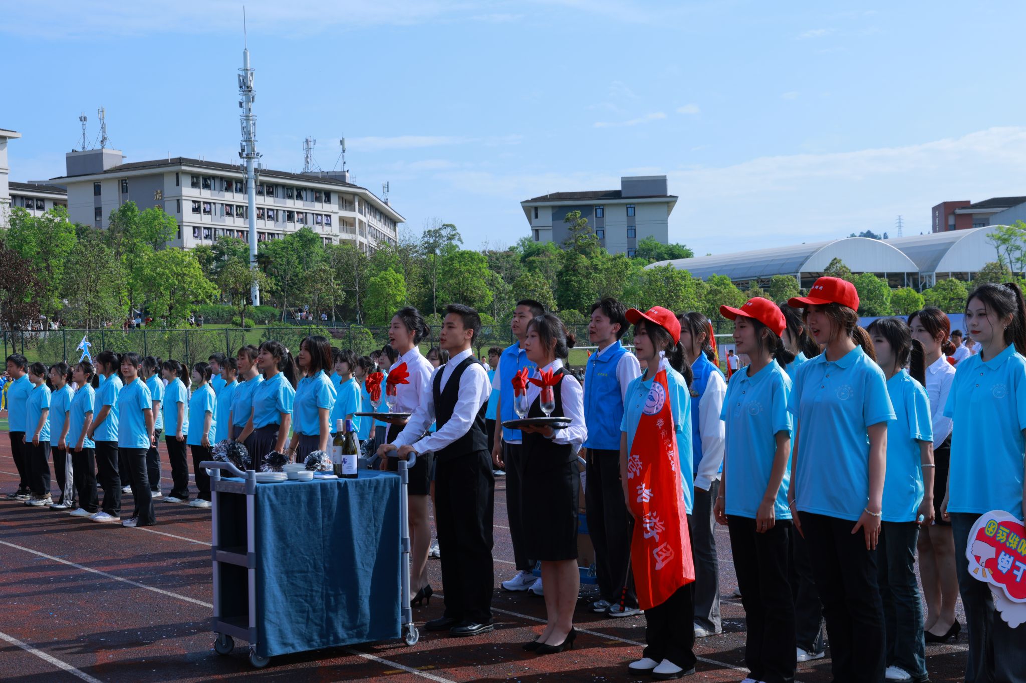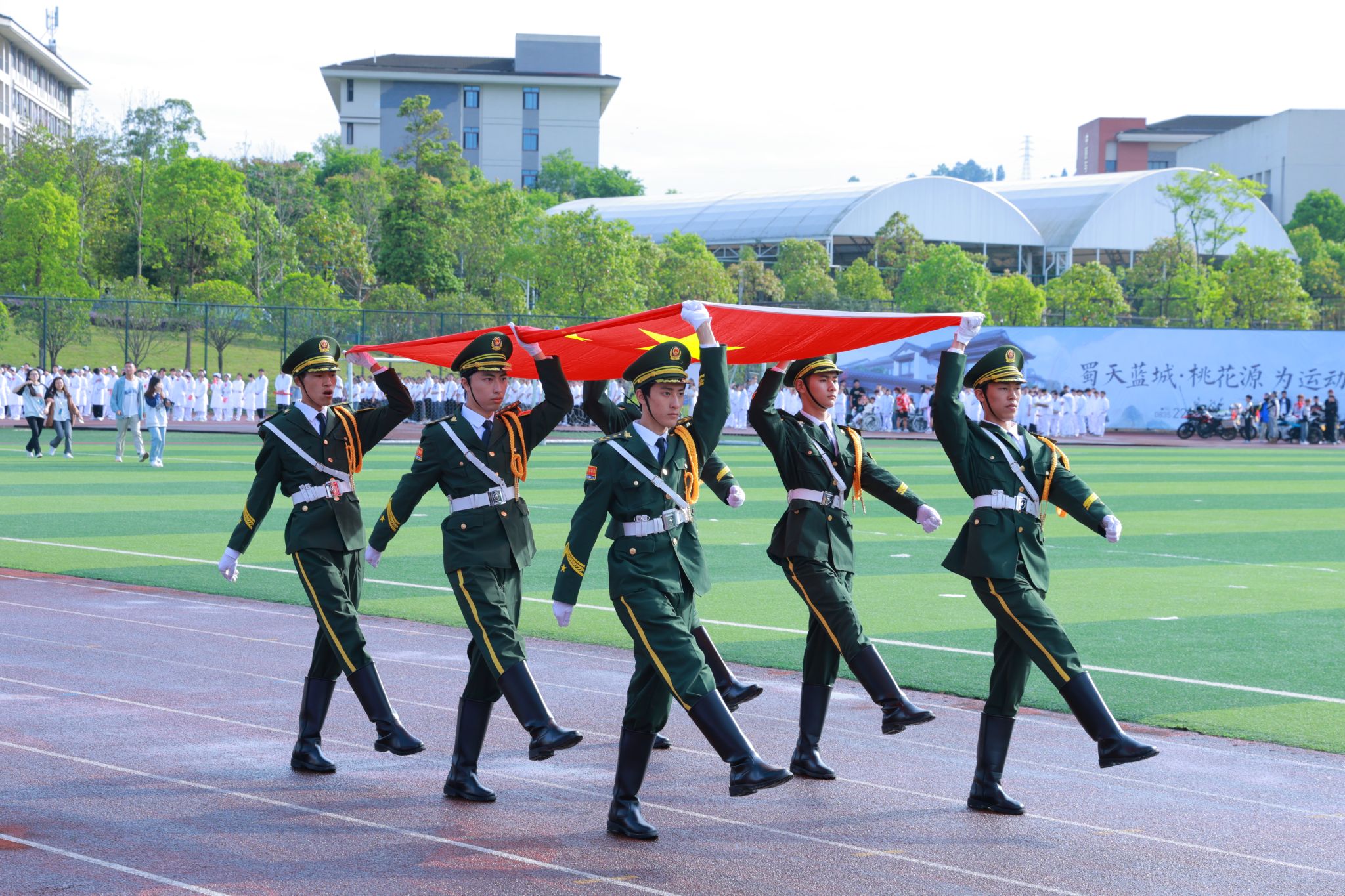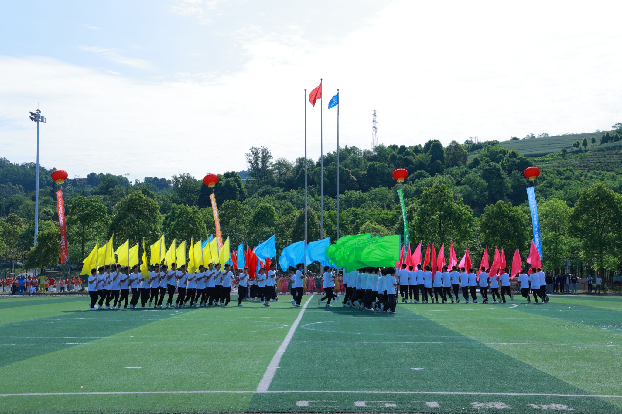 随着6名精神抖擞护卫队员手擎国旗步伐铿锵迈入运动场,开幕式的序幕正式拉开。彩旗方阵、各二级学院方阵、留学生方阵和教职工代表、裁判员等11个方阵昂首阔步走过主席台。各二级学院方阵的着装专业特色鲜明,道具别具匠心,口号声高亢嘹亮,展现了青年学子蓬勃向上的精神风貌。留学生方阵出场赢得阵阵掌声,他们身着本国传统服饰,为运动会增添了国际色彩。教师代表和裁判员方阵步伐整齐,神采奕奕。