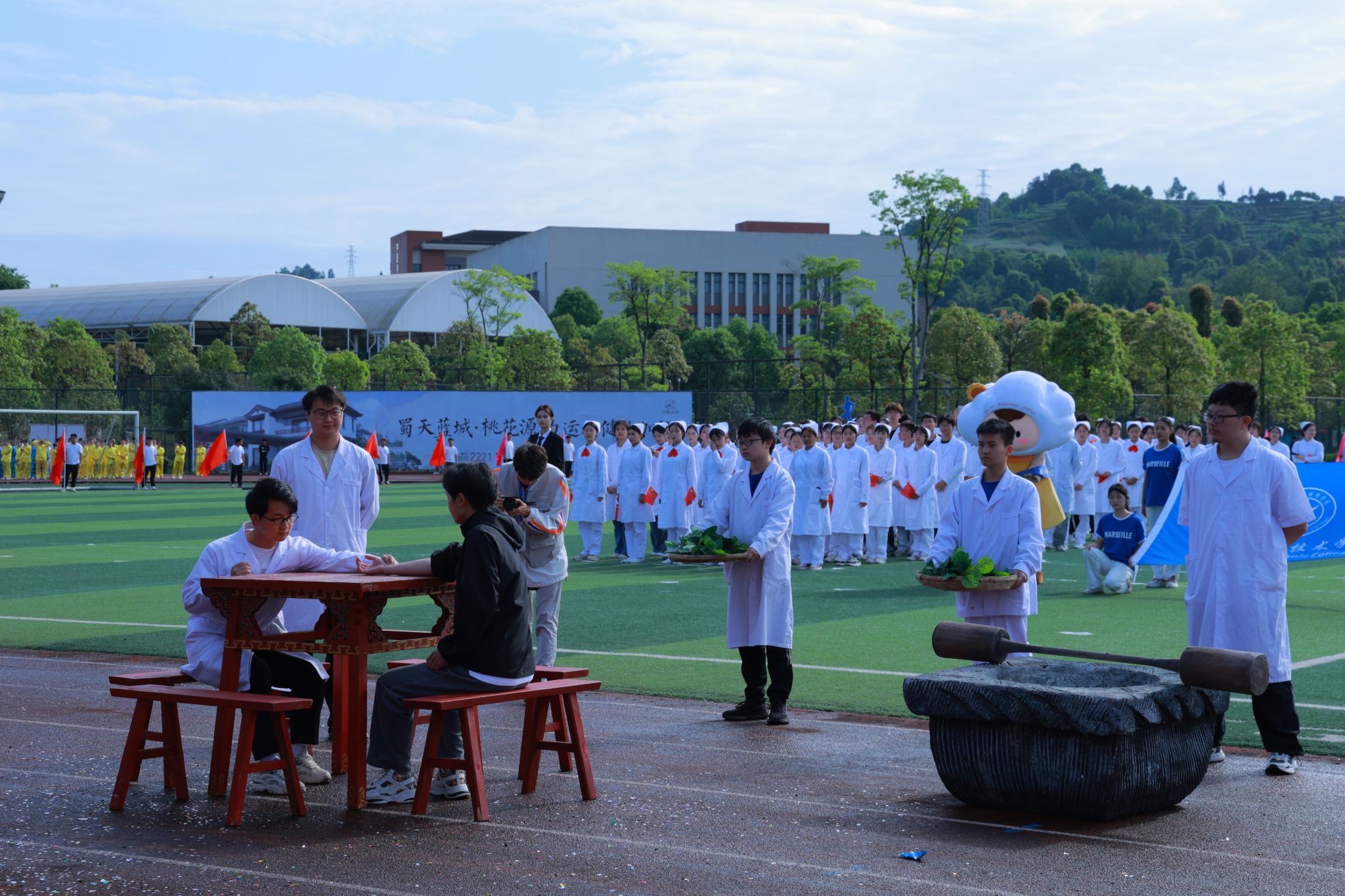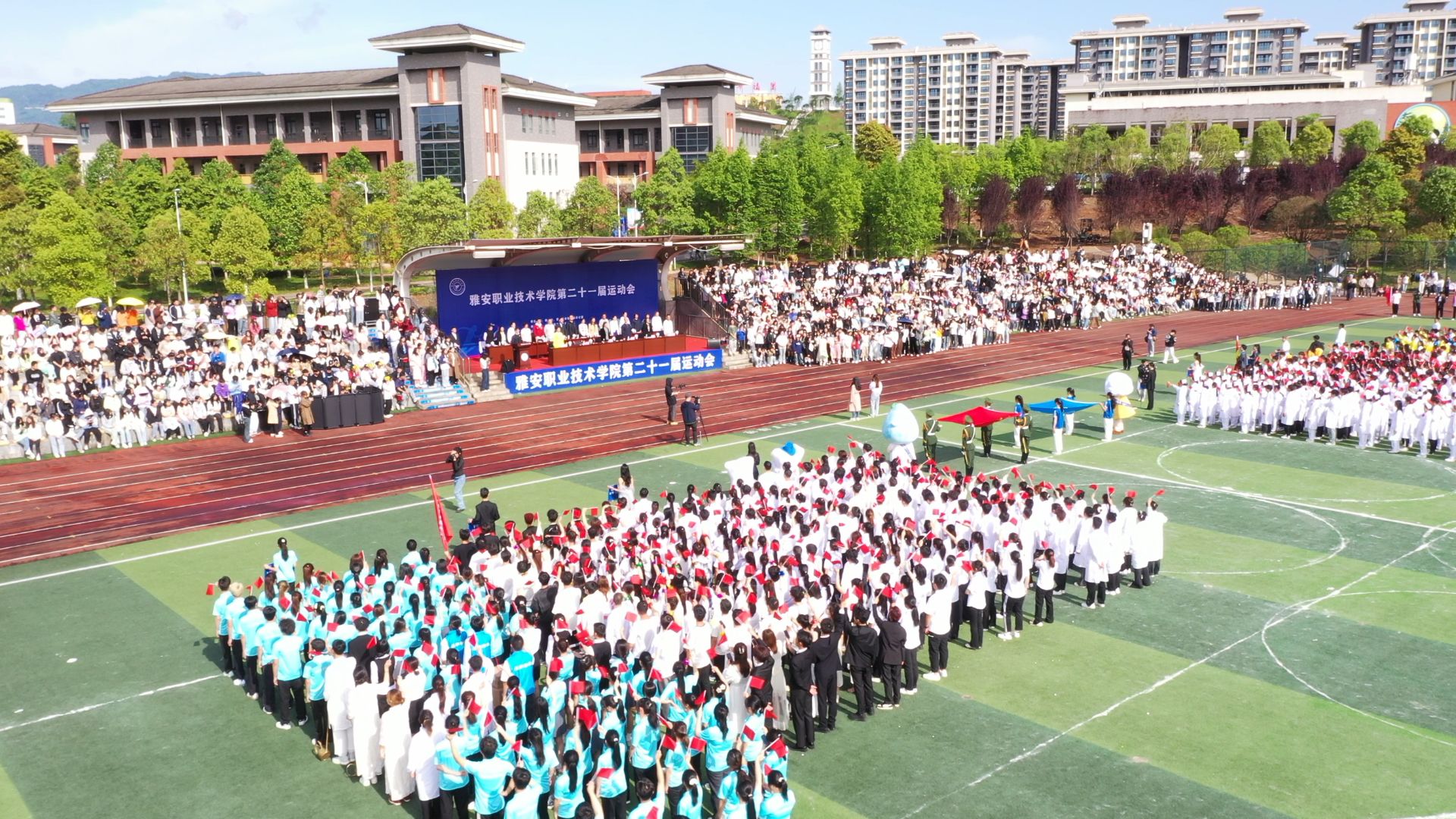 夏安琼宣布运动会正式开幕的话音刚落,现场彩球纷飞、礼乐齐鸣,彩旗队、啦啦操、学生大型团体操、教职工八段锦表演轮番上阵,青春的活力与激情在运动场上尽情绽放,气氛瞬间达到高潮。