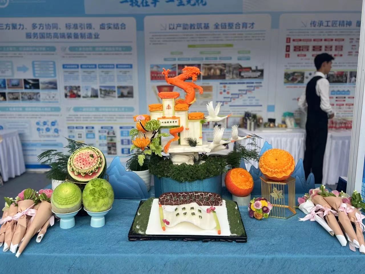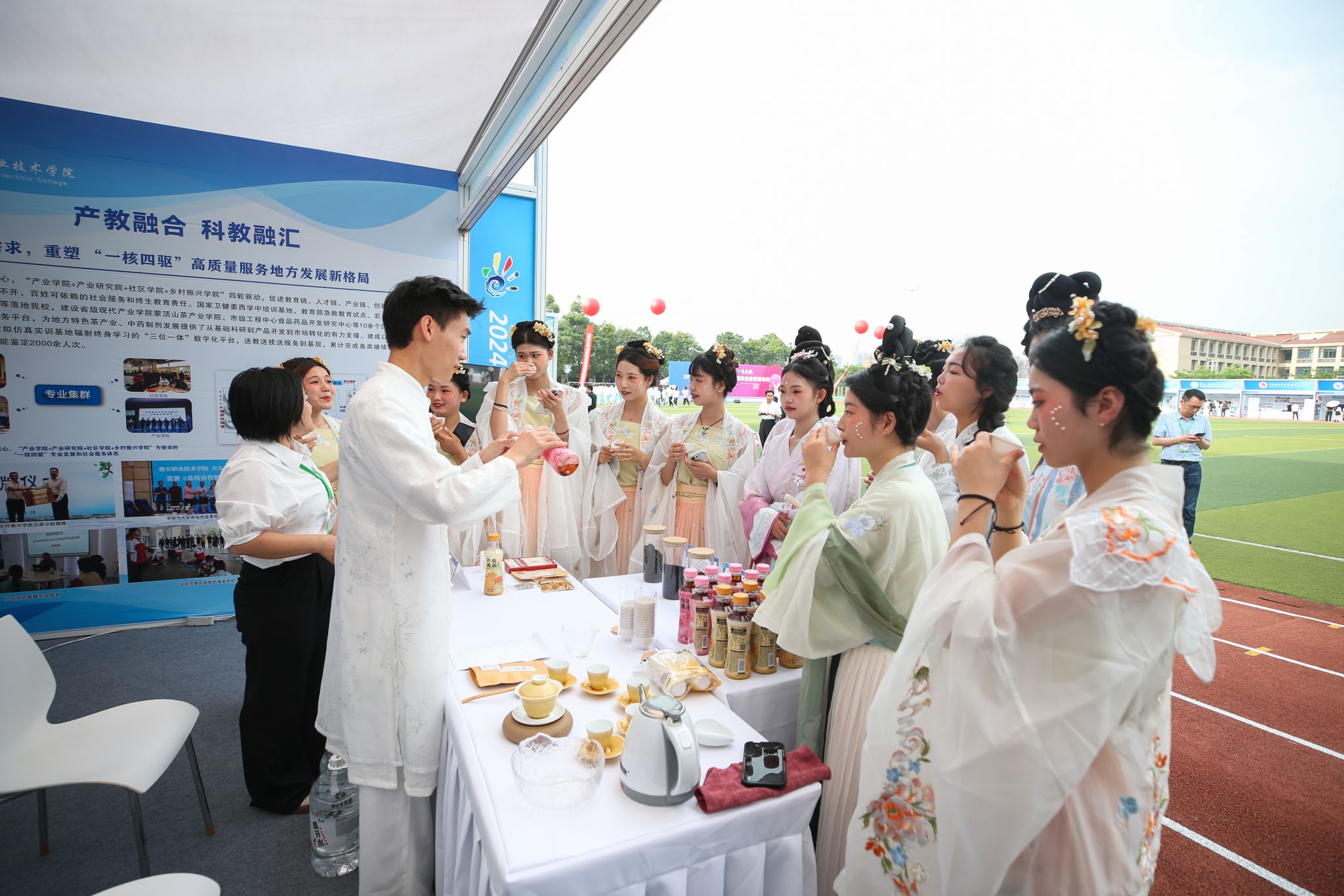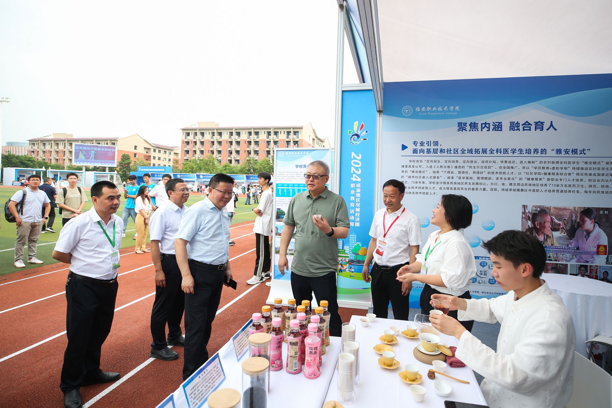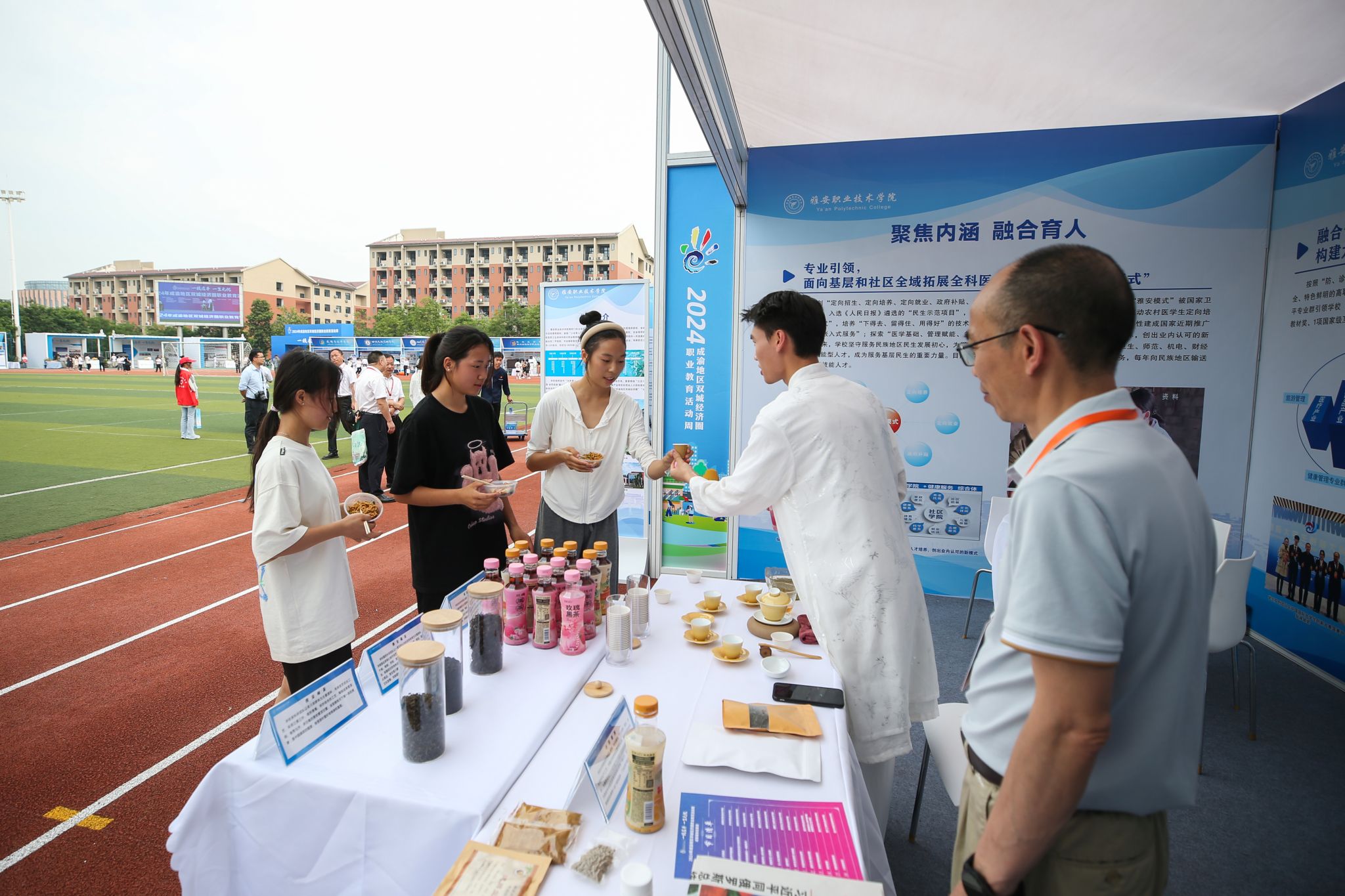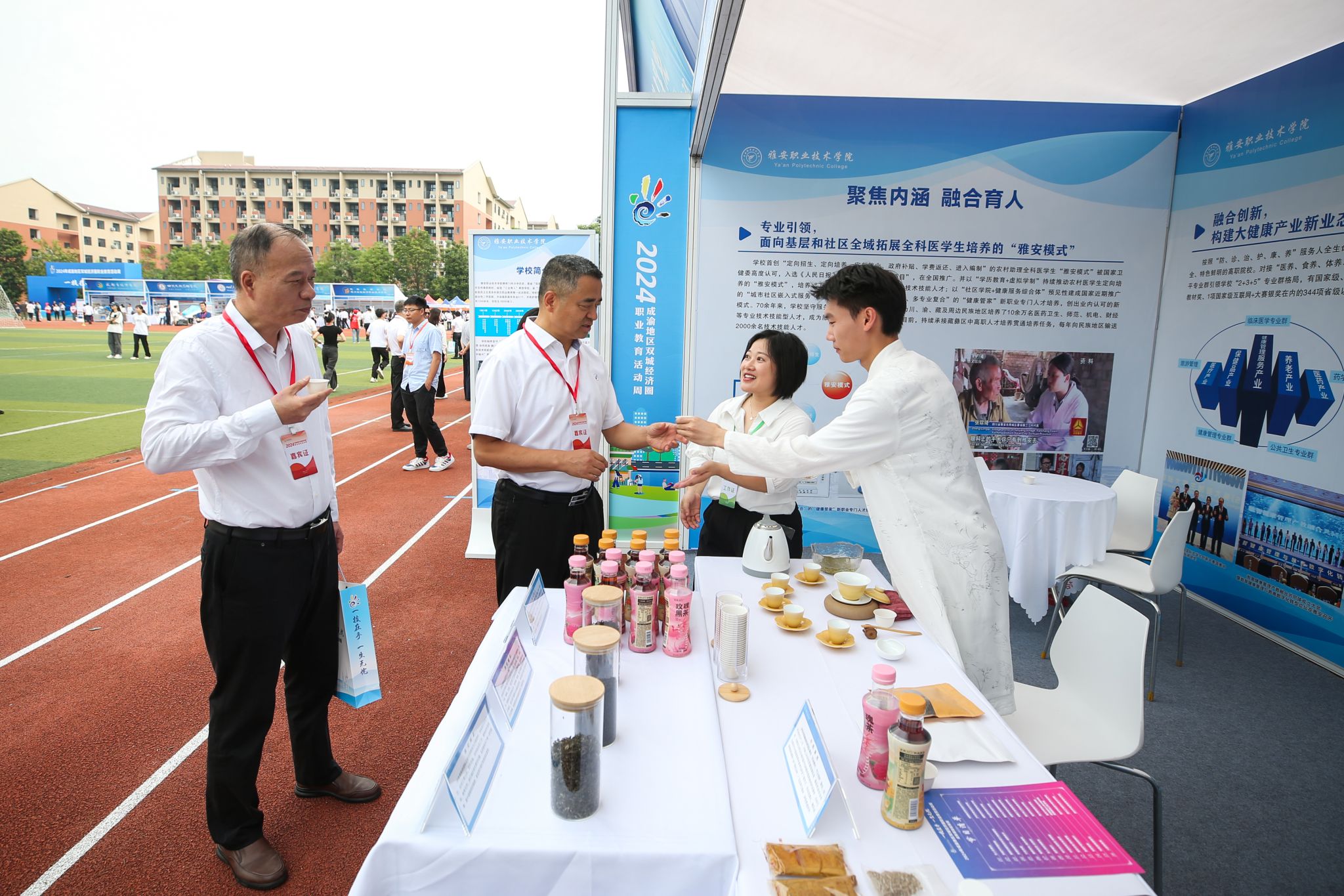 学校的独立展台以“立足川西 协同成渝 融入产业 服务民生”为主题,围绕产教融合体系构建、大健康产业专业集群建设、职教出海、医学人才培养“雅安模式”等方面的积极探索,以视频、图文、科研成果转化实物等形式展示了学校在对接区域产业需求,深化产教融合,构建“专业集群+产业学院、产业研究院、乡村振兴学院、社区学院”的“一核四驱”专业发展与社会服务体系,支撑和促进专业人才培养,服务大健康产业以及区域产业发展和基层医疗卫生等方面的成功经验和做法。茶艺与茶文化专业学生身着汉服端坐展台前,雅乐相伴,净手、温壶、投茶、摇香、闻香、冲泡……行云流水的优雅举止和娴熟精湛的茶艺茶技,冲泡出的一杯杯香溢醇厚的雅安绿茶、藏茶,深深吸引了与会领导和兄弟职校的师生驻足观看、品尝,学生们的技能展示受到大家的认可与称赞。