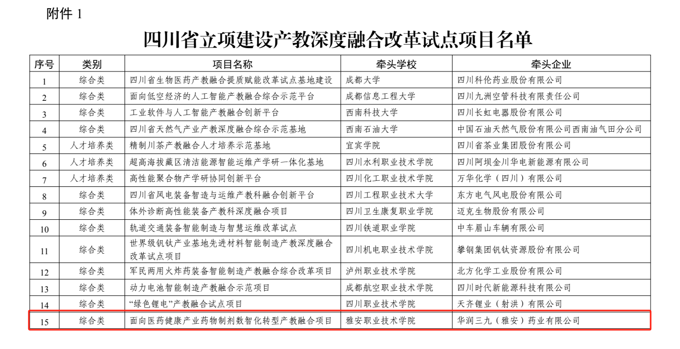 近日,四川省财政厅、四川省教育厅等单位联合发布了《关于立项建设四川省产教深度融合改革试点项目有关事项的通知》,公布了四川省立项建设产教深度融合改革试点项目名单,由学校与华润三九(雅安)药业有限公司联合申报的“面向医药健康产业药物制剂数智化转型产教融合项目”项目,历时四年准备,成立51人专班申报团队,由学校党委副书记、校长黄诚带队答辩,经过激烈角逐,终于从众多申报项目中突出重围而出,成功入选立项名单,成为全省首批立项的十五个项目之一。