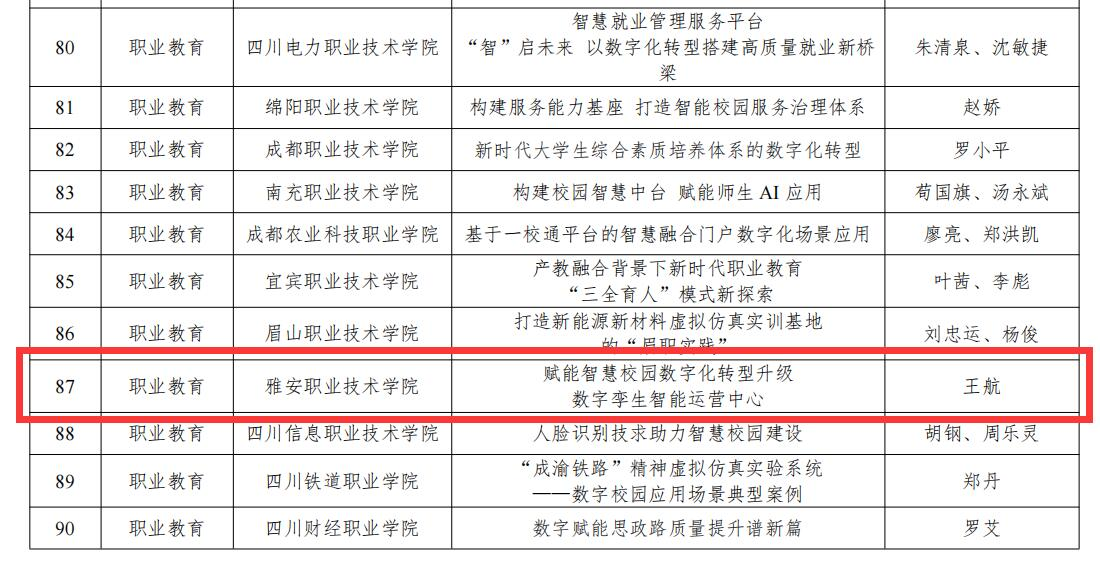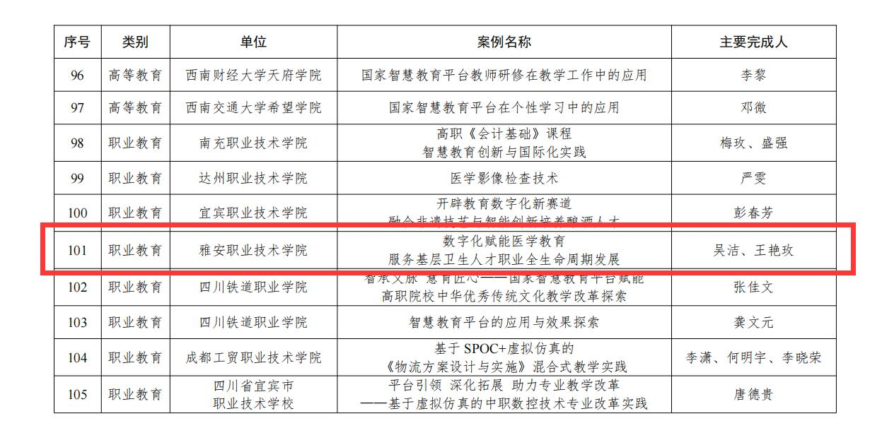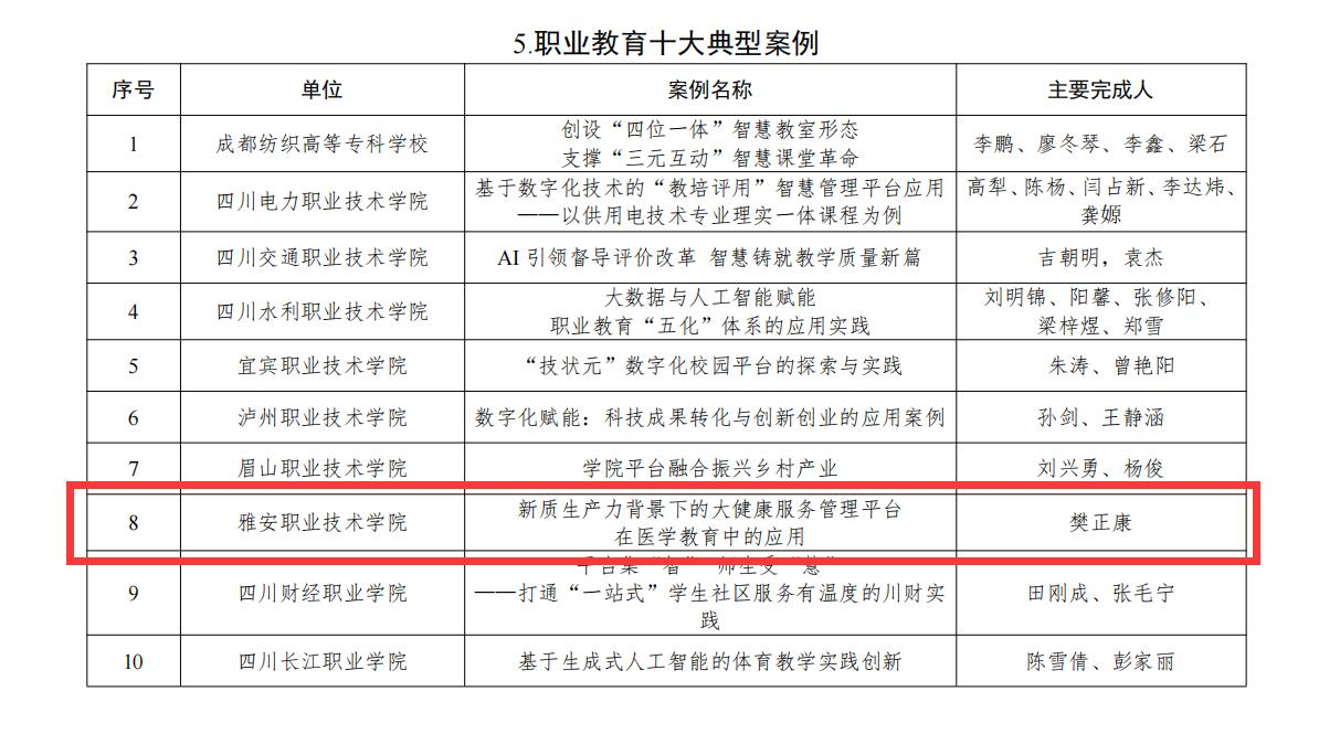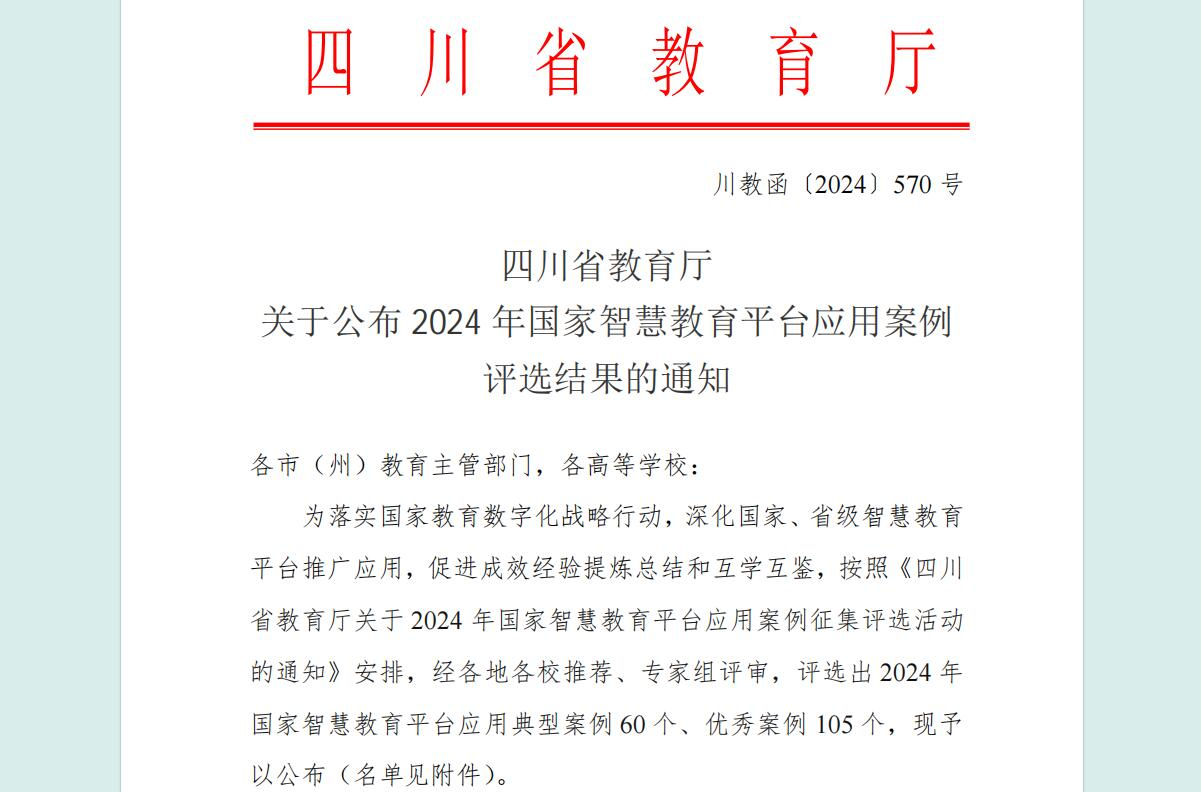 近日,四川省教育厅公布了2024年数字校园应用场景案例和国家智慧教育平台应用案例评选结果,学校报送的《新质生产力背景下的大健康服务管理平台在医学教育中的应用》入选四川省2024年数字校园应用场景的职业教育十大典型案例,《赋能智慧校园数字化转型升级:数字孪生智能运营中心》入选四川省2024年数字校园应用场景的数字化场景优秀案例,《数字化赋能医学教育服务基层卫生人才职业全生命周期发展》入选四川省 2024 年国家智慧教育平台应用优秀数字化案例。