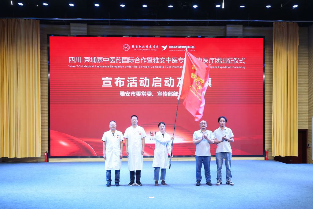 仪式在《四川—柬埔寨中医药国际合作项目》出征专题片的播放中拉开帷幕。在热烈的掌声中,聂颖宣布活动正式启动,并为出征医疗队授旗。