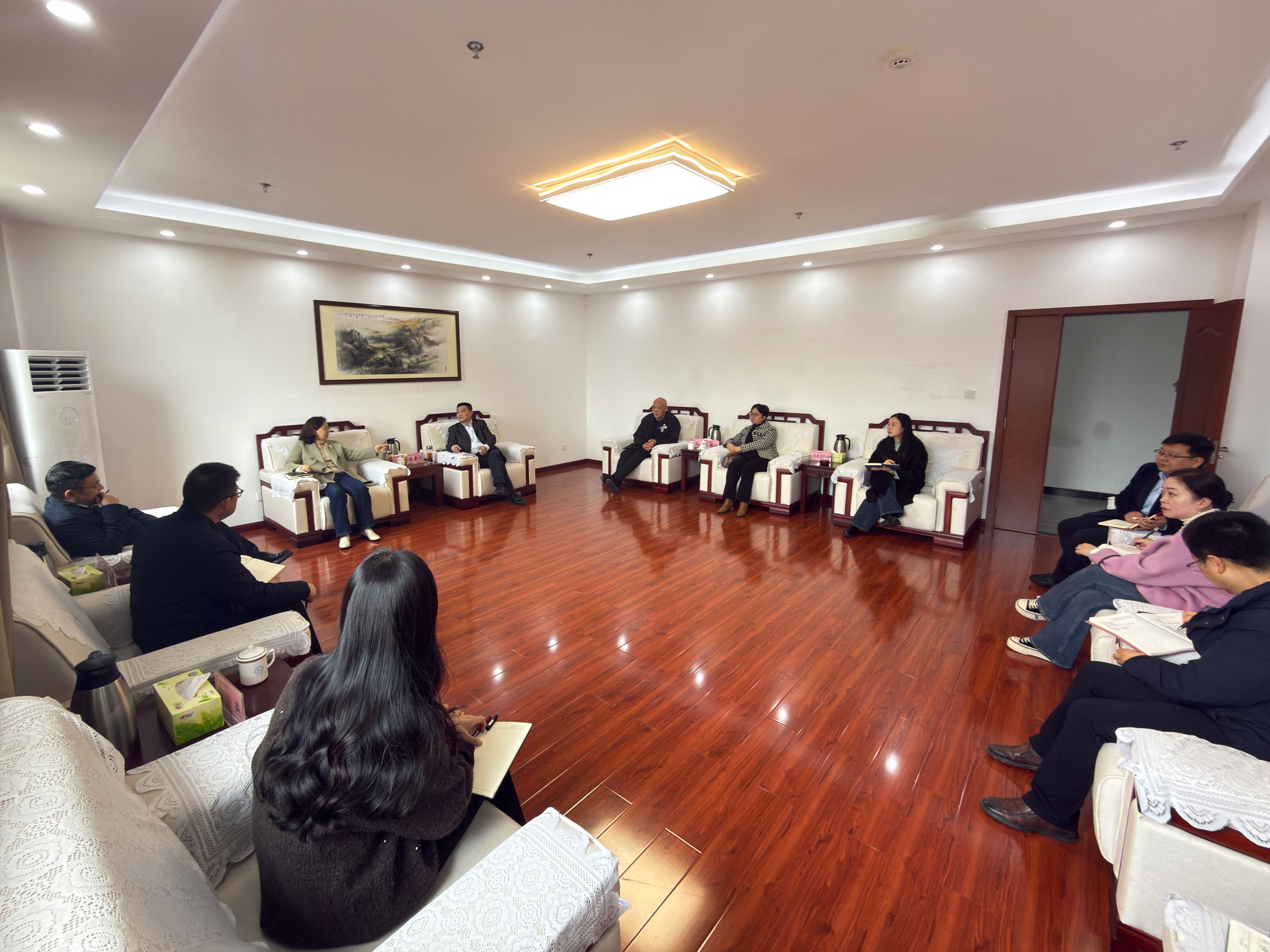 市委副秘书长唐海洋,市民政局局长高勇、市卫健委主任郝燕、市卫健委副主任卫刚,市经信局副局长周园,学校党委常委、副校长樊正康,副校长彭裕红参加调研和座谈。