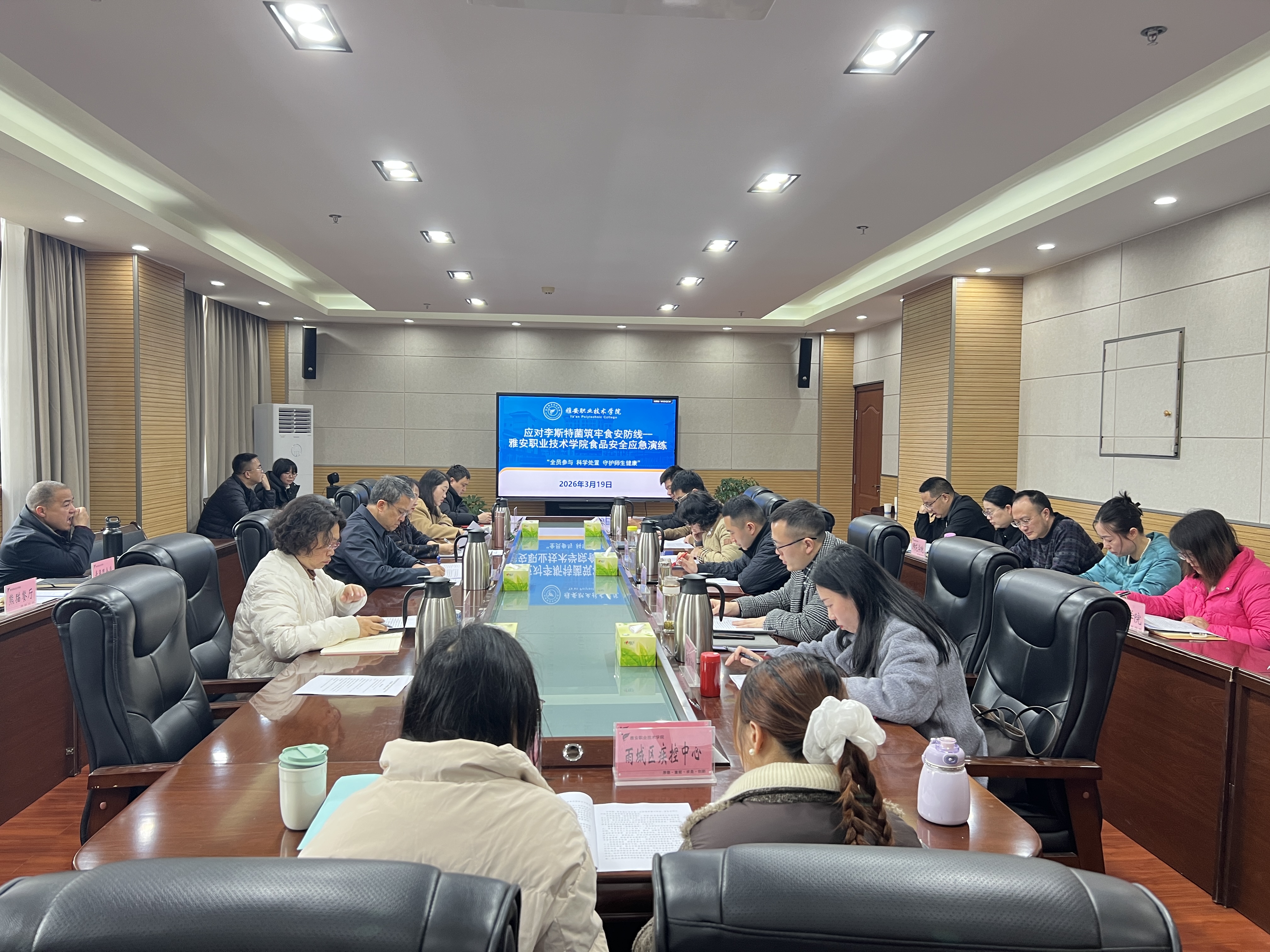 为深入贯彻落实食品安全工作要求,切实提升校园食品安全突发事件应急处置能力,筑牢师生“舌尖上的安全”防护线,3月19日上午,学校在经开区校区综合楼303会议室采取桌面推演方式组织开展食品安全突发事件应急演练。本次演练以特定菌感染引发的食源性疾病为模拟场景,聚焦校园食品安全应急处置全流程,系统检验应急预案的科学性、可行性与实操性。学校党委副书记、校长黄诚担任演练总指挥,党委常委、副校长付洪涛任副总指挥,党委常委、宣传统战部部长、工会主席夏安琼及食品安全突发事件应急领导小组全体成员单位负责人、各校区食堂运营管理团队、食品安全员等全程参加演练。