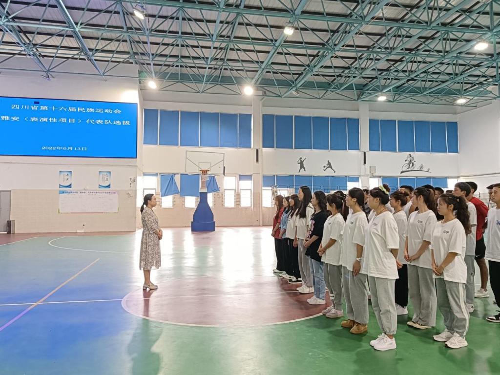 6月13日,雅安市统战部民族事务科科长刘晓航、市侨联机关综合科科长王富强一行4人在经开区校区体育中心就四川省第十六届民族运动会表演性项目雅安市代表队队员进行选拔,中医与康复养生学院院长江成鹏、副书记沈军和公共体育教研室主任何莉陪同。