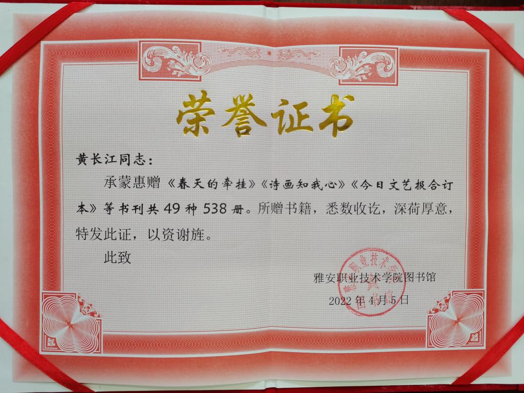 目前,中外名流出版社社长兼总编辑黄长江向学院图书馆捐赠《生命的风铃》、《春天的牵挂》、《诗画知我心》等图书、期刊及报纸合订本共538册。