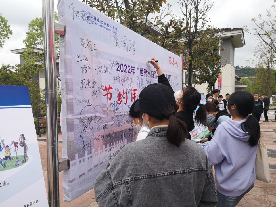 本次活动在学院悬挂节水宣传横幅5幅、制作并分发节水宣传单1100余张、分发印有节水宣传标语的扇子约1500个,并组织师生员工在“节约用水 你我同行”签名墙上签名。