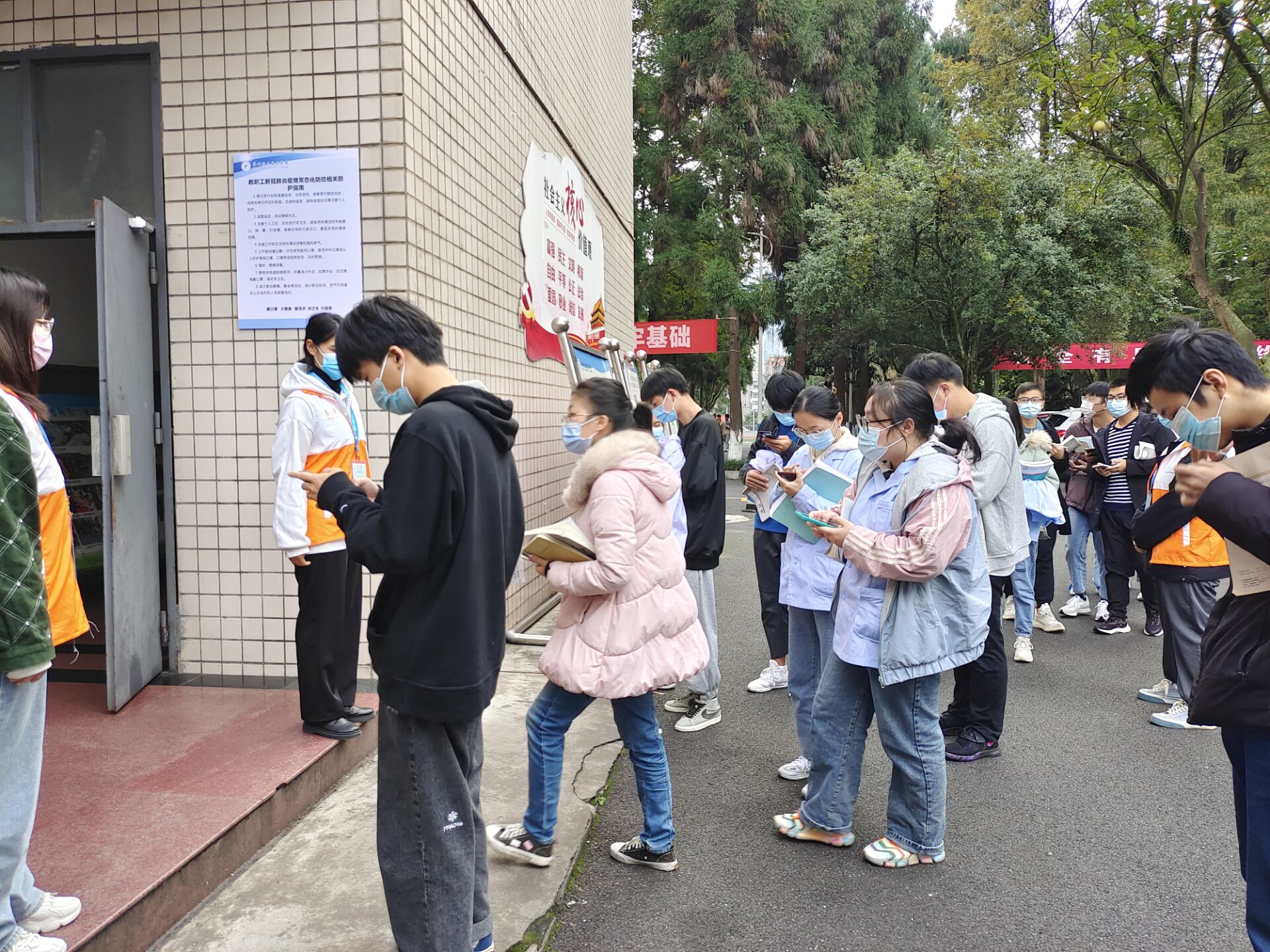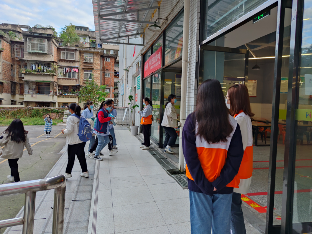 志愿者分布在育才路校区的食堂、教学楼、宿舍、校门口外卖区等地,分早中晚三班到岗,负责检查行程卡、健康码,利用小喇叭、宿舍入户等方式宣传校园疫情防控知识,提醒人群戴口罩,为未佩戴口罩的师生免费派发口罩。
