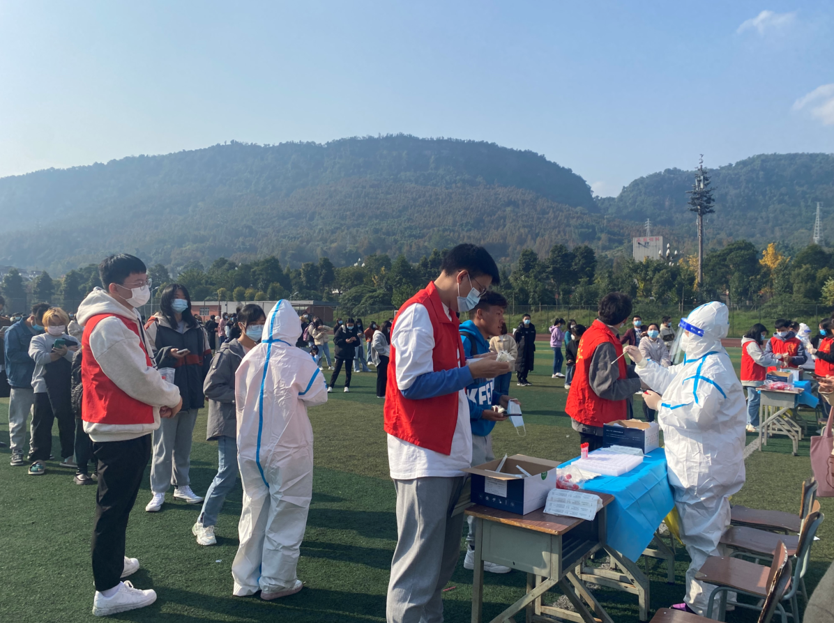 下午1点45分,志愿者准时到位。“请各位同学带好口罩,保持一米间隔距离……”“请大家打开天府健康通健康码,将手机亮度调到最高……”。志愿者们分工明确,干劲十足,协助医护人员查验健康码、核实人员信息、维护现场秩序、开展文明劝导,同学们积极配合,现场秩序井然,核酸检测工作有序、高效开展。在大家共同努力下,下午4点半,三校区近13000余名同学全员完成核酸检测。
