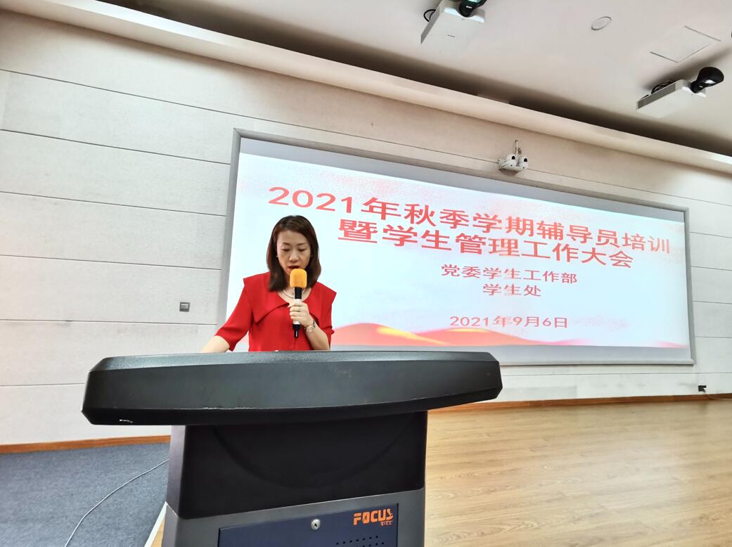 9月6日,在经开区校区第二教学楼2204多功能厅,召开学院2021年秋季学期辅导员培训暨学生管理工作大会。学院党委委员、副院长樊先茂,学生处负责人,各二级学院书记、副书记、全体辅导员、班主任和学生处工作人员共计107人参加了会议。会议由学生处副处长陈淼玲主持。