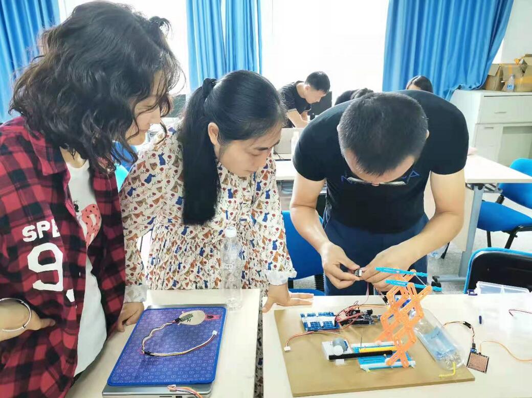 本次培训以实战课程为主,培训内容丰富实用,包括大数据可视化大屏制作、人工智能、物联网、智能物品分拣系统等前沿知识。企业培训导师生动形象地讲解与示范,采用学生获奖作品作为案例,体现了以创促教、反哺教学的生动实践。参训教师的积极性很高,认真汲取数智化改造知识,畅聊大数掘与人工智能带来的对教师、教材、教法的改革。