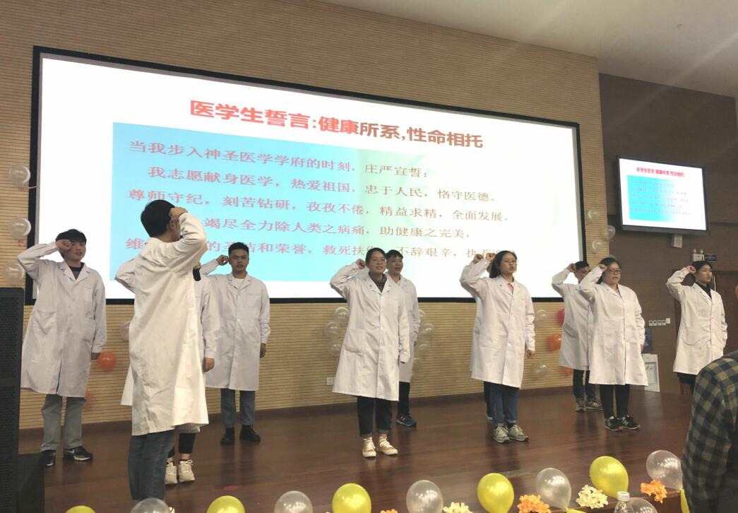 大会以“附属医院60年变化”的视频拉开序幕。薛正毅老师致辞介绍学院发展历程,勉励同学们执着追求,努力实现自己的“大医梦”。观看医学生视频体会医生的坚持、努力与艰辛。新生代表全美熹同学发言,表明了医学生的宗旨与信念。随后在学习部李希阳的带领下,全体同学庄严宣誓:决心竭尽全力除人类之病痛,救死扶伤为祖国医药卫生事业奋斗终身。