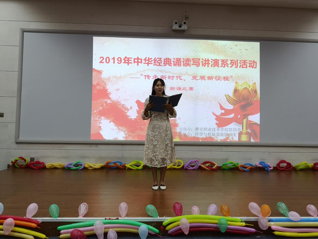 为庆祝新中国成立70周年,五四爱国运动100周年,引导同学们共抒爱国情怀,传承经典美德,展示新时代青年的良好精神面貌,6月20日,药学与检验学院承办的学院2019年中华经典诵读写讲演系列活动之“传承新时代,竞展新征程”朗诵比赛在实训与服务中心2204多媒体教室举行。药检学院党总支书记杨泽刚、团总支书记鲜敏及辅导员老师、学生代表共100余人参加了比赛。
