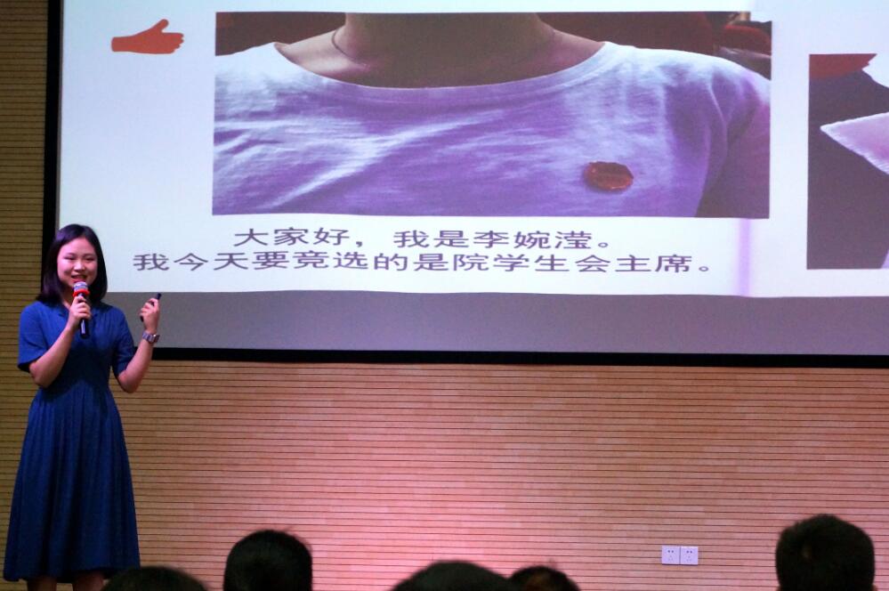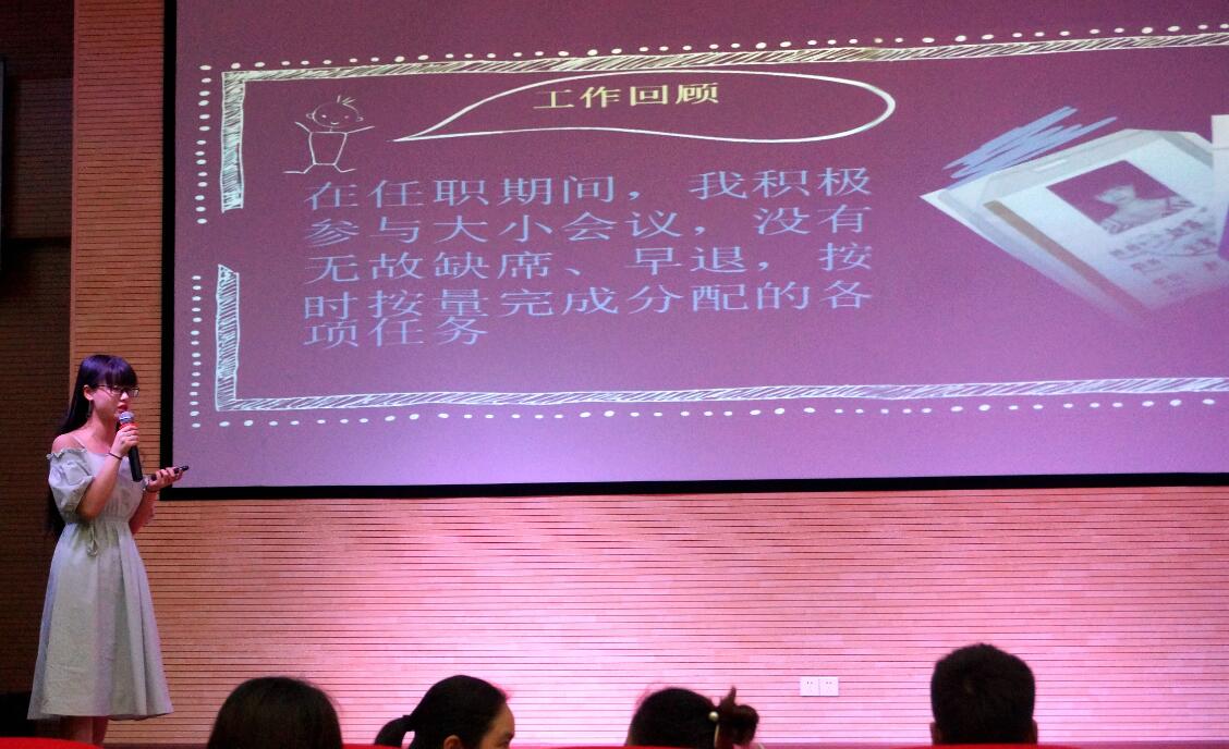 通过前期的初选,共有114名学生进入复选。本次竞聘分为展示、答辩和投票三个环节,参赛的选手配合PPT,就各自的基本情况、竞选优势、对竞聘岗位认识以及工作设想进行演讲。他们有的激情澎湃,有的从容自信,有的诙谐幽默,有的利索干练,展现出青年学子积极上进的精神风貌。选手们慷慨激昂的竞选演讲赢得场下阵阵掌声,演讲结束后,台下成员进行投票。按照《2018届院团委学生干部换届选举实施方案》,院团委将在干部考核试用1个月后宣布任职名单。