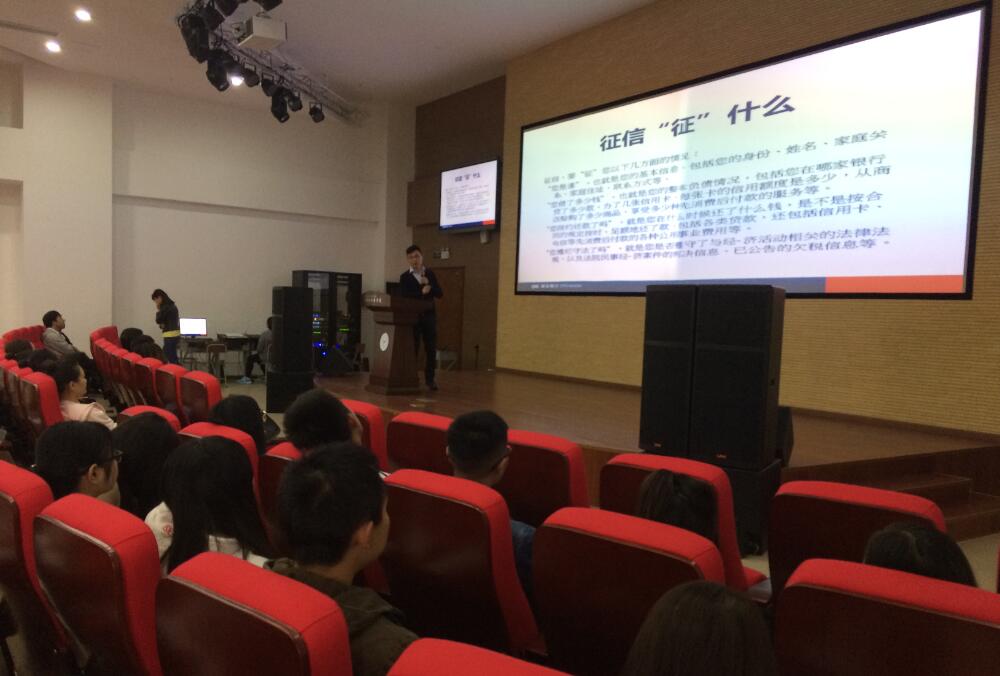 【本网讯】为了进一步丰富综合素质拓展项目,充分发挥第二课堂的育人作用,10月10日下午,由旅游经济管理系和中国人民银行雅安分行联合开展的“征信”讲座在青年路校区学生活动中心举行。此次讲座由浦东发展银行雅安分行征信中心客户经理周鹏飞先生主讲,旅游经济管理系主任李霓、系党支部副书记刘永恩及相关老师和2015级、2016级的近300名同学聆听了此次讲座。