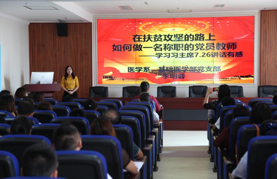 会上,祝继英传达了习近平总书记7月26日在省部级主要领导干部专题研讨班开班式上的重要讲话精神;附属医院党支部党员代表彭亮、王琳琳、邓小雪、宋燃以及医学系党支部党员李明蓉、张晓惜等6位同志分别以“不忘初心、自信奋进”、“如何做一名称职党员教师”、“树牢“四个意识”,做好本职工作”、“我为什么加入中国共产党”、“实干出实力,实力生自信”和“幸福安康、美在健康”等为题,结合讲话精神和自身工作发言。他们表示要把“7.26”讲话精神内化成自己的工作动力,努力工作,大胆创新,不断提高业务能力,在平凡的岗位上积极发挥党员先进示范作用,为医院和系部发展作出贡献。
