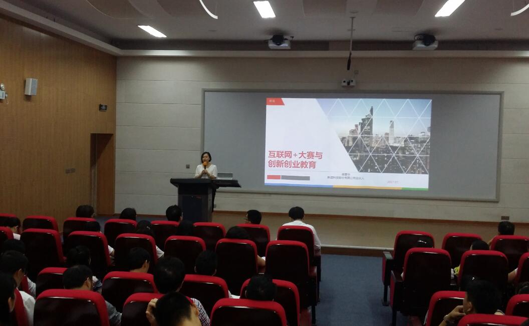 随后,新道股份科技有限公司的侯爱华总经理以《互联网+大赛与创新创业教育》为题介绍了创新创业教育的理念,并结合互联网+大赛进一步深入讲解了如何系统构建创新创业教育体系,同时通过一些创新创业项目介绍了创新创业教育的教学方法,与大家分享了“以赛促教,以赛促学,赛教一体,课赛融合”的教学模式。