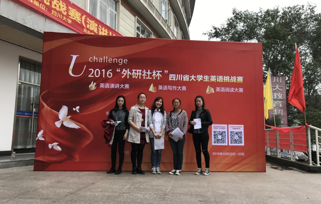 【本网讯】10月23日,2016年“外研社杯”全国大学生英语挑战赛四川赛区高职组赛事在四川大学望江校区落下帷幕,来自四川三十多个高职院校的参赛选手分别参加了英语演讲比赛、英语写作比赛和英语阅读比赛。通过激烈的角逐,最终我院英语教育2015级1班学生赵兰舟获得演讲比赛二等奖,英语教育205级1班学生毛晶、护理(涉外方向)2015级1班学生徐婷分别获得写作比赛专业组、公外组三等奖,英语教育2014级1班学生张号、护理(涉外方向)2015级1班学生徐艳梅分别获得阅读比赛专业组、公外组三等奖。