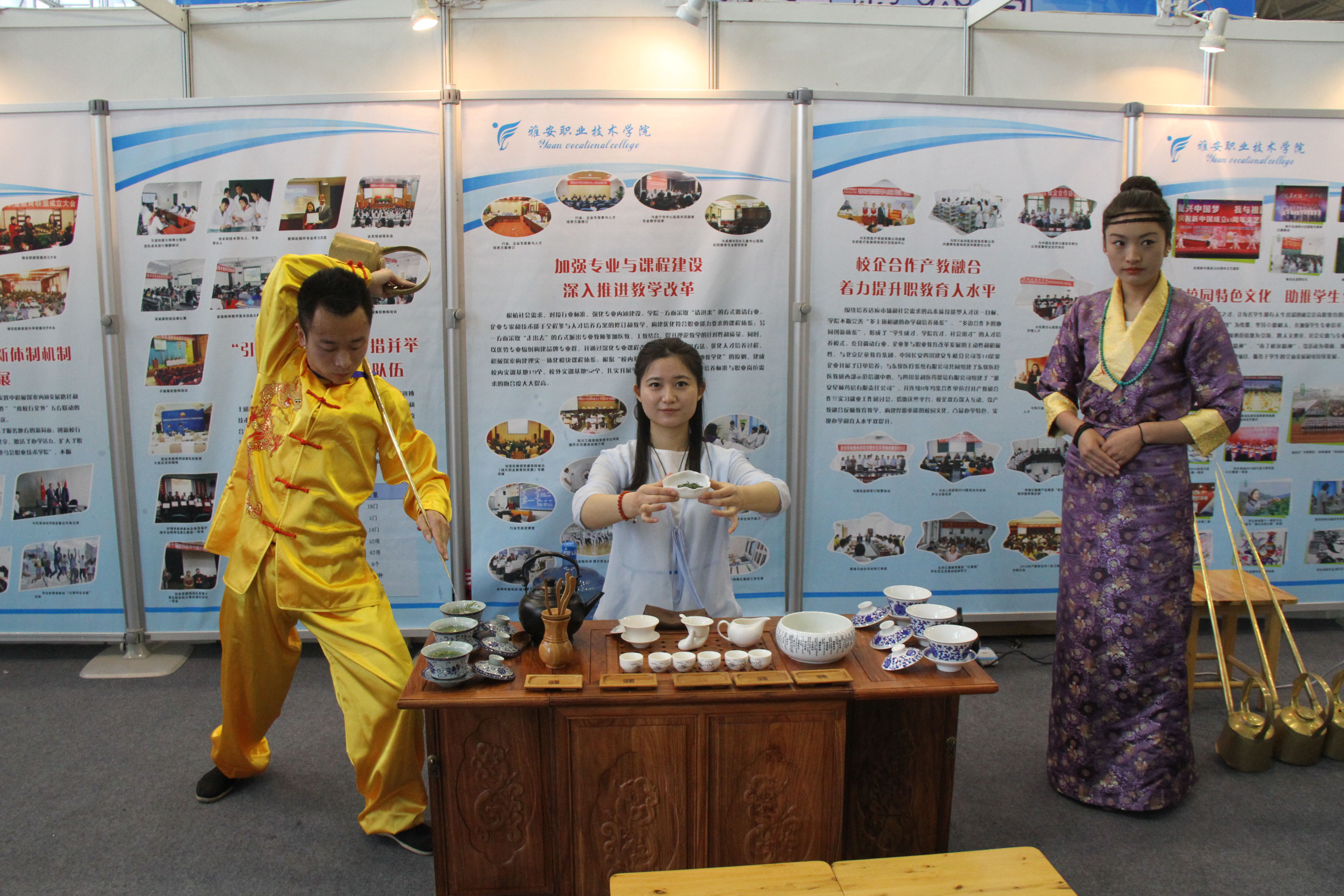 4月9-10日,普专旅游管理2013-1班的张入文、周友亮、拥忠等3位同学受学院选派,组团赴成都参加了“2015年四川省职业教育活动周(教学成果展)”,进行了茶艺茶技展示,同学们清新脱俗的绿茶茶艺、温润纯熟的藏茶茶艺受到嘉宾们的驻足赞许。其中,周友亮同学表演的“龙行十八式”长嘴壶茶艺代表学院登上了主办方设置的舞台,提壶把盏间的酣畅淋漓获得了观众的热烈掌声。