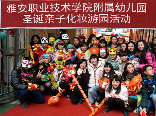 为深化“院园合作,学岗结合”,提升学生岗位素质,12月25日,又是一年圣诞季,在教育系副主任陆小路及部分老师的带领下,教育系2014级学前教育1班和2013级英语教育班的同学们参与了雅安雨城区第一幼儿园(beat365英国官方网站附属幼儿园)的“圣诞亲子化妆游园活动”。