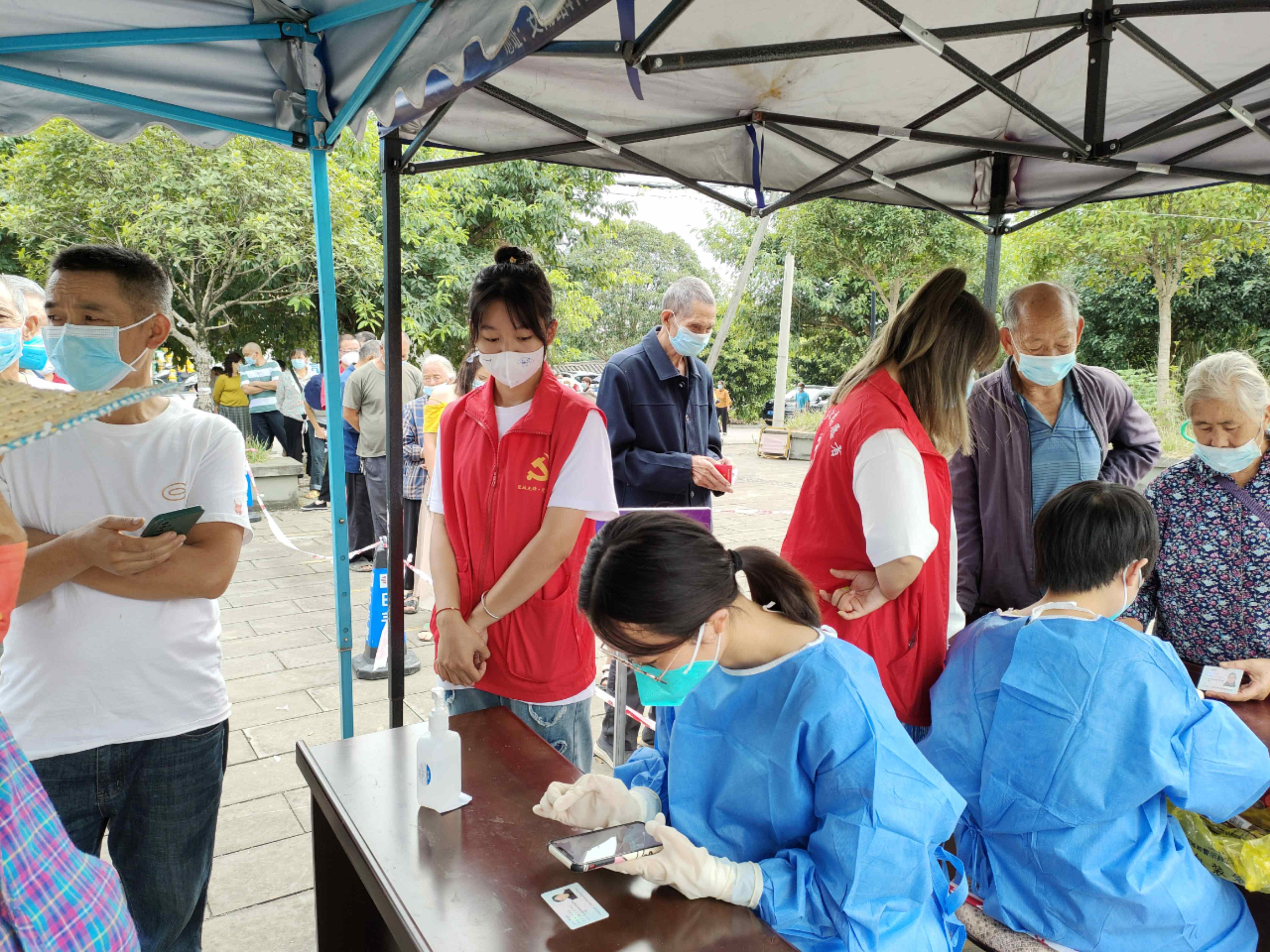 我是一名大一学生,在返乡前期我就有打算返乡后要为自己的家乡贡献一份自己的力量,于是我加入了我所在的街道疫情防控志愿者团队。志愿者服务地点在孔明街道太阳社区文化站。我主要是辅助录资料的人员,帮助一些老年人写电话号码、准备身份证,同时也要维持现场秩序。