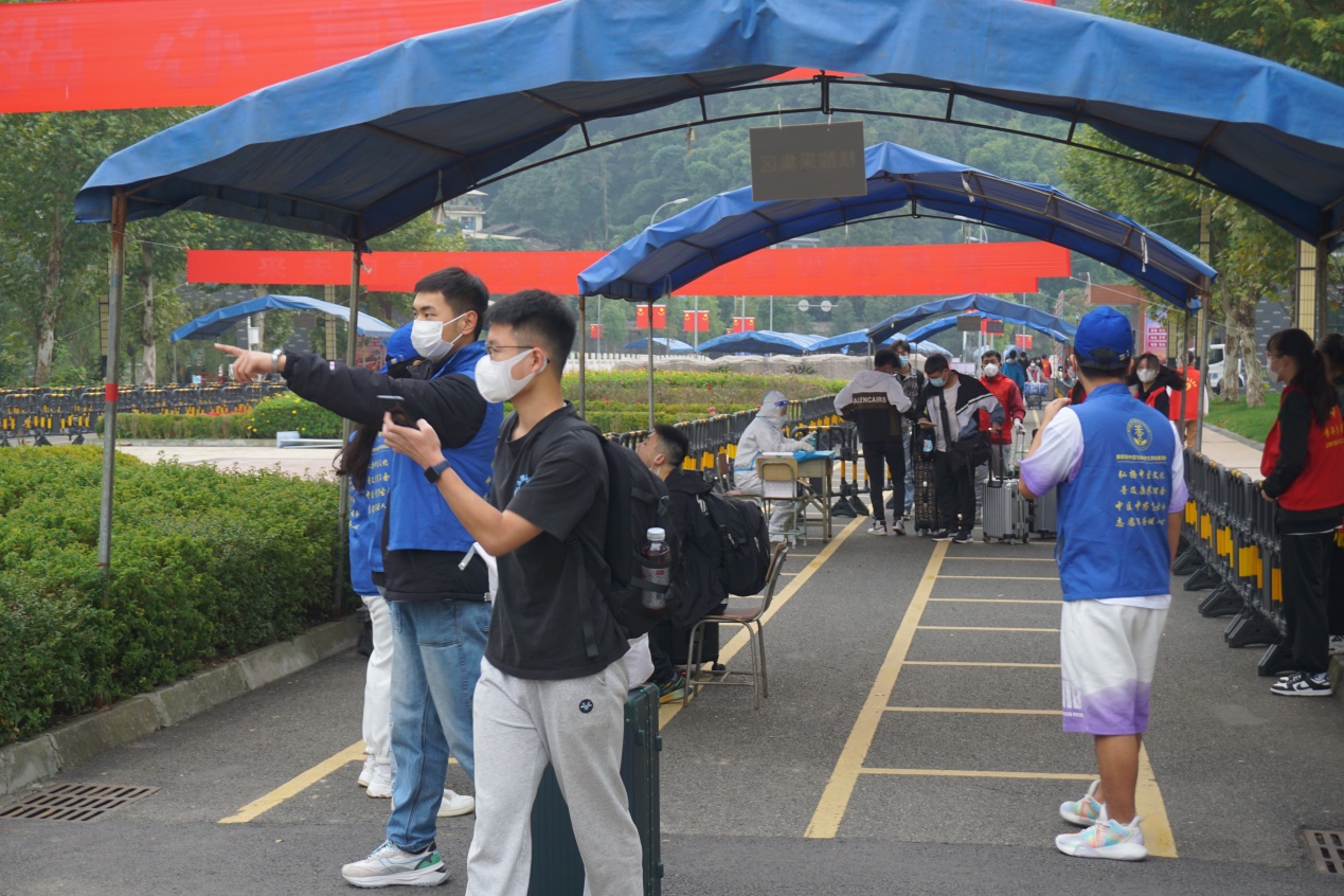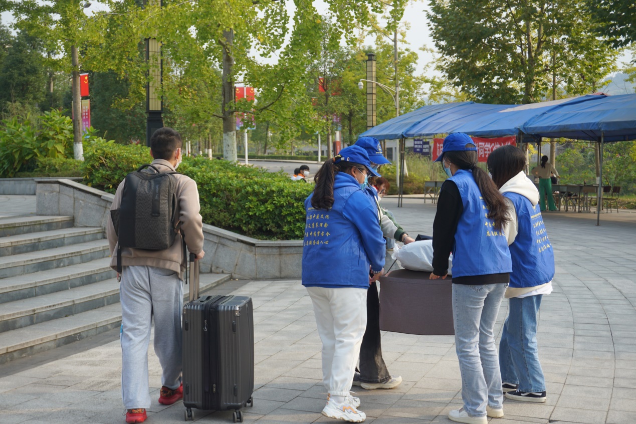 师生志愿者从上午8点至下午7点,一直活跃在校园里,他们帮助新同学搬运行李、对学生托运的行李进行分拣、参与返校申请审批查验和进校“三码”查验、为学生指引寝室方向、介绍校园等。师生志愿者热情周到,分工明确,积极协调各项工作对接,为返校学生提供便利服务,是秋日校园里一道美丽的风景线。