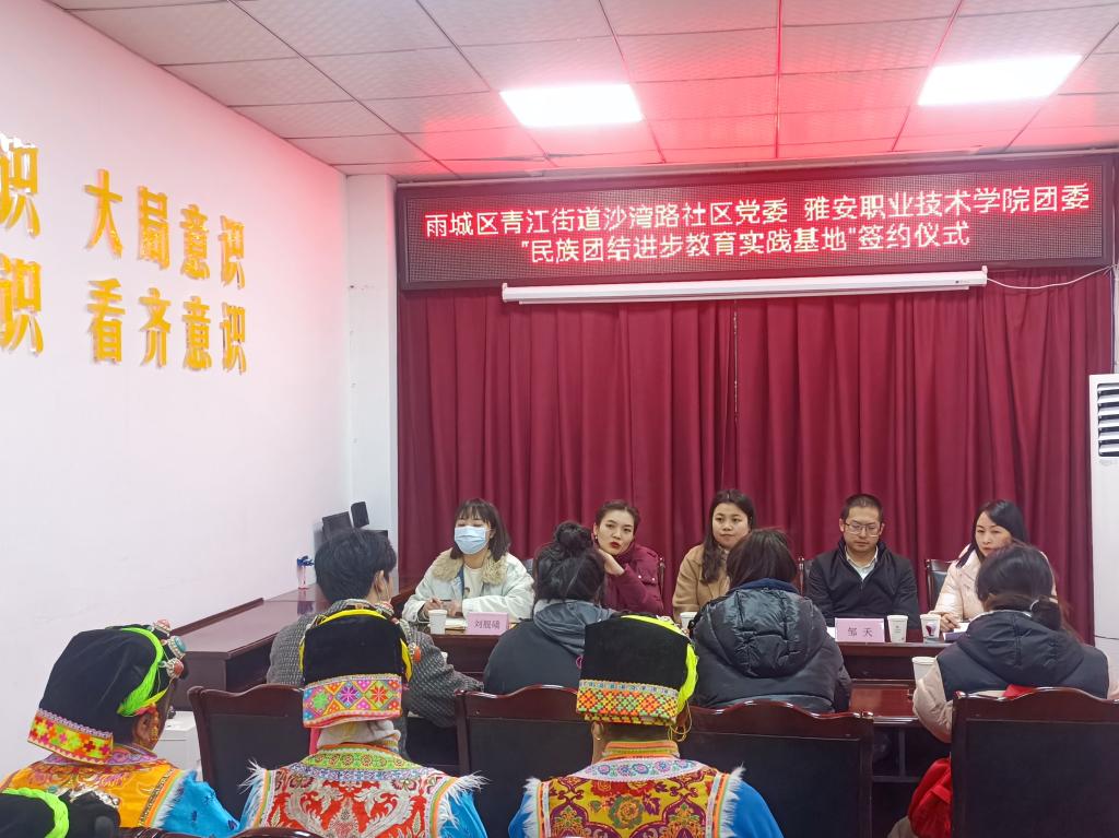 2月13日,学院团委与雨城区青江街道沙湾路社区党委在社区党群服务中心举行“民族团结进步教育实践基地”签约仪式。青江街道党工委副书记杨理梅,青江街道党工委委员、武装部部长邹天,青江街道沙湾路社区党委书记魏娜,学院团委副书记郭庆,学院师生代表以及社区少数民族代表参加签约仪式,仪式由邹天主持。