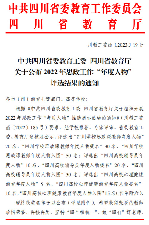 近日,中共四川省委教育工委、四川省教育厅公布了2022 年思政工作“年度人物”评选结果。学院教师王坤容入围“四川学校思政课教师年度人物”,教师张晓惜入围“四川高校辅导员年度人物”,教师王可晖入围“四川高校心理健康教育年度人物”。