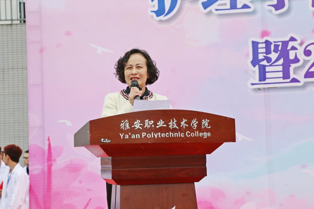 王静致辞,她号召同学们认真学习专业知识,提升专业技能,以实际行动践行南丁格尔誓言,用自己的能力去帮助到更多人,并希望同学们坚守初心、牢记使命、奋勇前行,绽放雅职学子的青春风采。