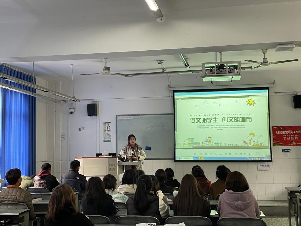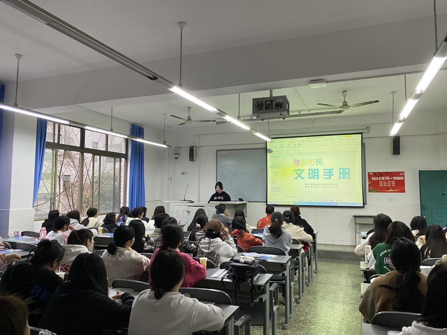 各二级学院于3月16日前召开大学生文明教育主题班会,深入学习学院校训、学院精神及社会主义核心价值观,结合《学生手册》相关要求,认真学习《“创文明城市,建文明校园,做文明师生”倡议书》《雅安市民文明手册》,了解创建文明城市的相关知识,并号召同学们倡文明树新风,把文明理念融入日常生活中。其中,中医与康复养生学院在召开主题班会的同时,组织师生走上街头、走入社区,大力宣传创建文明城市的重大意义,积极开展“知荣辱树新风我行动”道德实践和文明劝导活动,响应雅安市创建文明城市的号召。