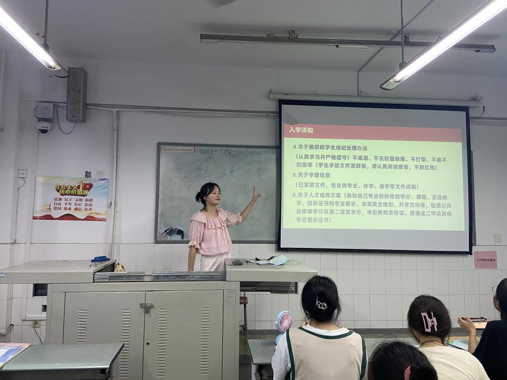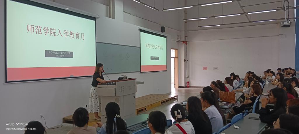 为让新生平稳度过开学适应期,拥有积极、充实的大学生活,师范学院通过班会、专题讲座等形式,向新生讲解奖助政策、校规校纪、校园安全、医疗保险、卫生防疫、学业规划、就业指导以及团学活动等丰富的校园文化生活“必记”“必知”事项,解答新生同学的疑惑,积极引领学生热爱生活、努力向上、学会独立、与同学友好相处,力求在入学教育阶段为新生描绘美好的大学初印象。