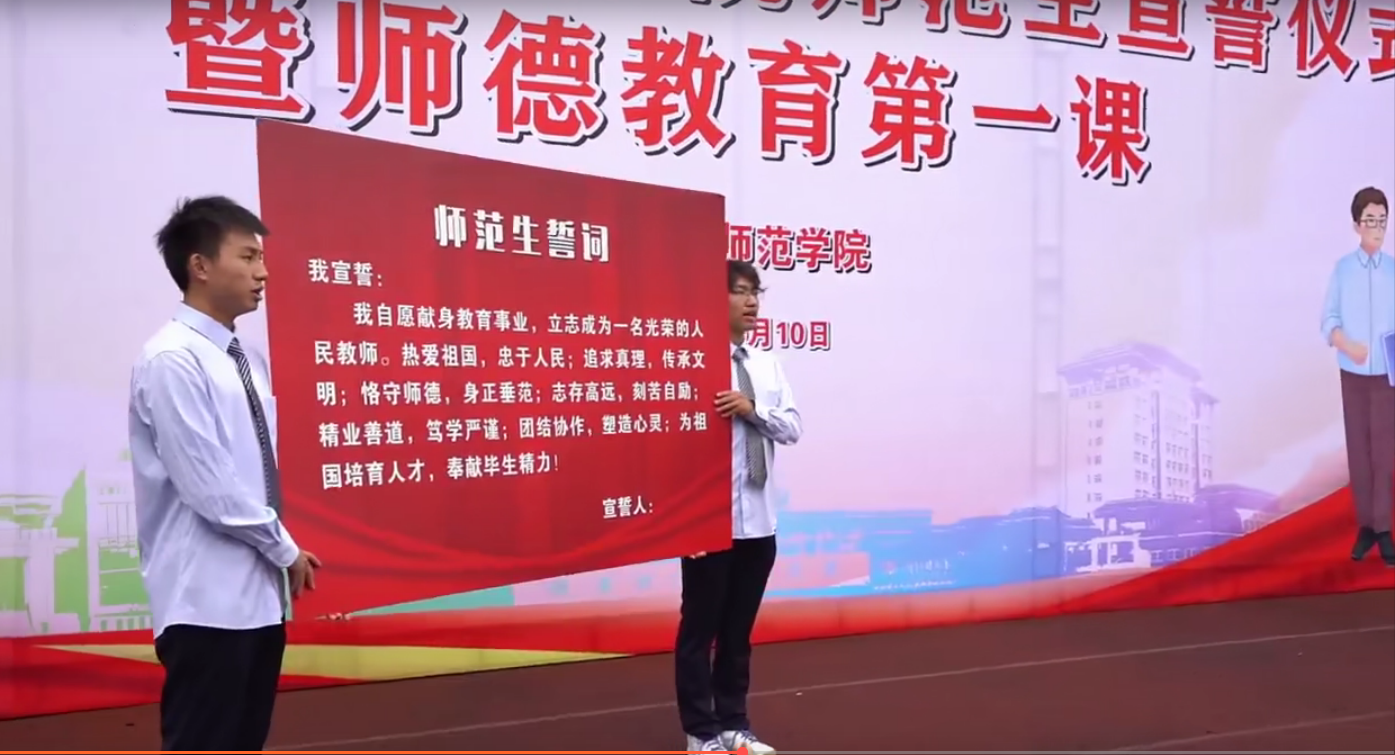 “我自愿献身教育事业,立志成为一名光荣的人民教师……”教师节当日,在青年路校区田径场,师范学院面向全体在校师范生举办了师范生宣誓仪式暨师德教育第一课作为新生“第一堂必修课”,引导学生以誓言为指引和动力,牢记自己身上的使命和责任,把“学高为师 身正为范”的信念融入自身的实际行动,按照“四有”好老师的标准严格要求自己,努力成为一名堪当民族复兴大任、德才兼备的好教师。