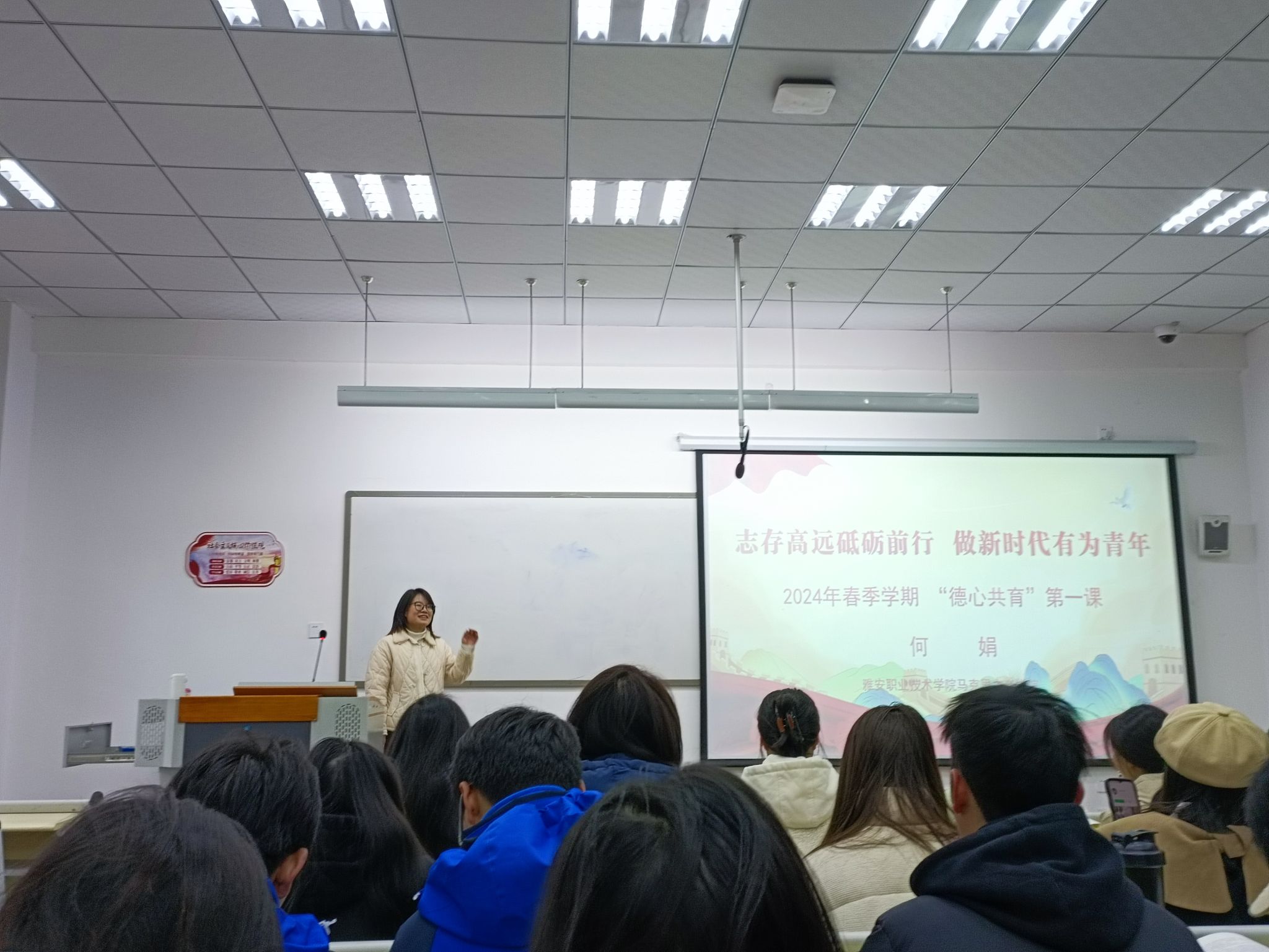 此次授课主题为“志存高远砥砺前行 做新时代有为青年”,借用热播电影《热辣滚烫》所传递的精神价值,围绕“青年大学生如何选择‘滚烫的人生’”这一话题,结合学院“厚德、重能、求是、创新”的校训,对学生们提出“做新时代有为青年”的希望。教师分别从树立坚定的理想信念、远大志向;保持干劲、勇于实践、敢于创新,努力提升自身综合素质;学会爱自己,增强自信心三个方面,为学生珍惜大学时光,拼搏出滚烫的人生增添精神动力。