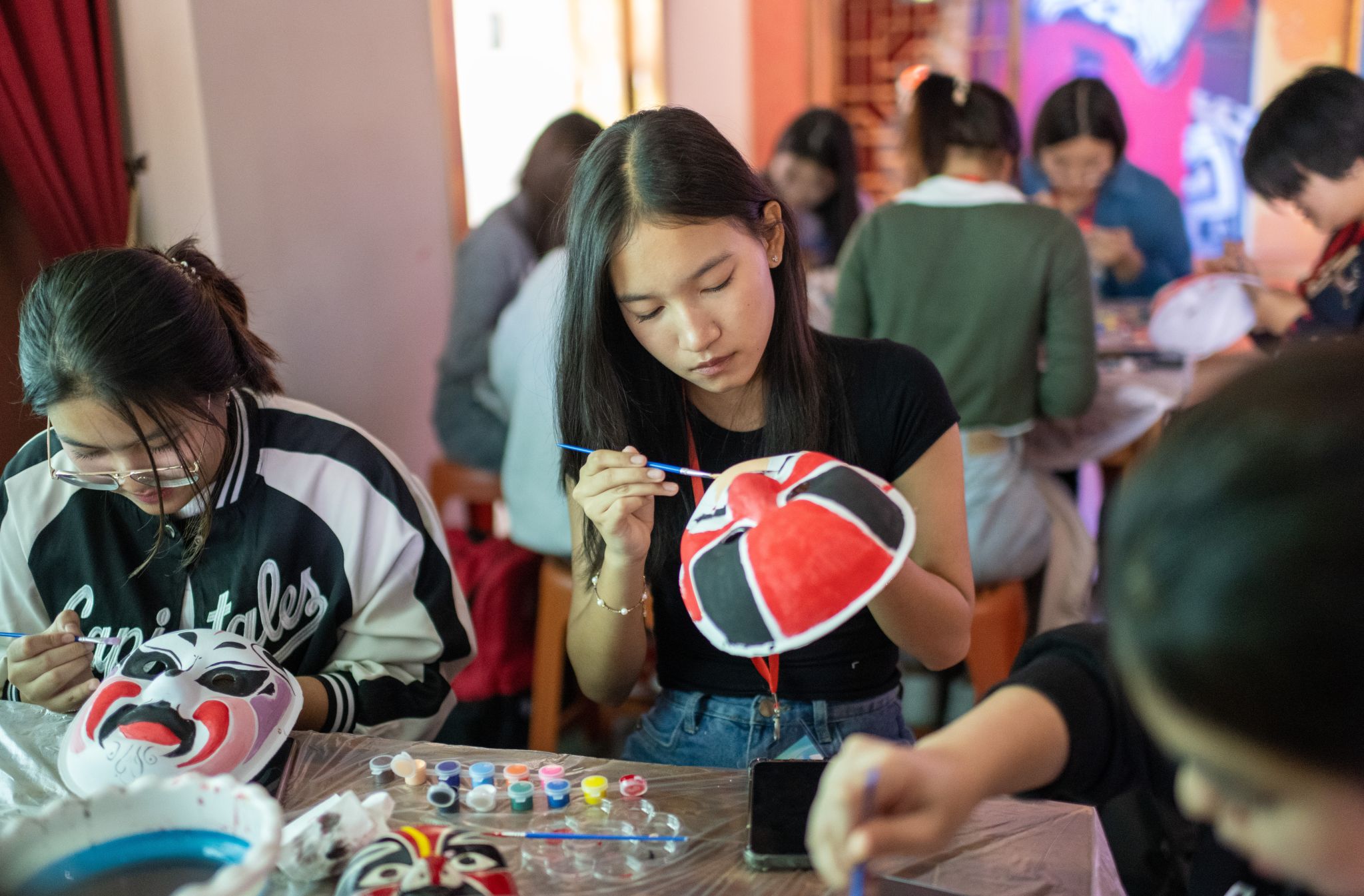随后,学校教师常恒、李昭颖为现场师生进一步讲解川剧脸谱背后的丰富内涵,帮助理解脸谱颜色、花纹的意义,组织大家画出属于自己的脸谱。设计、描线、勾勒、填色……,每位师生一笔一划将自己心中的川剧脸谱画了出来,绘出丰富人物形象的同时,更绘出了对川剧脸谱的理解、对中华优秀传统文化的热爱。