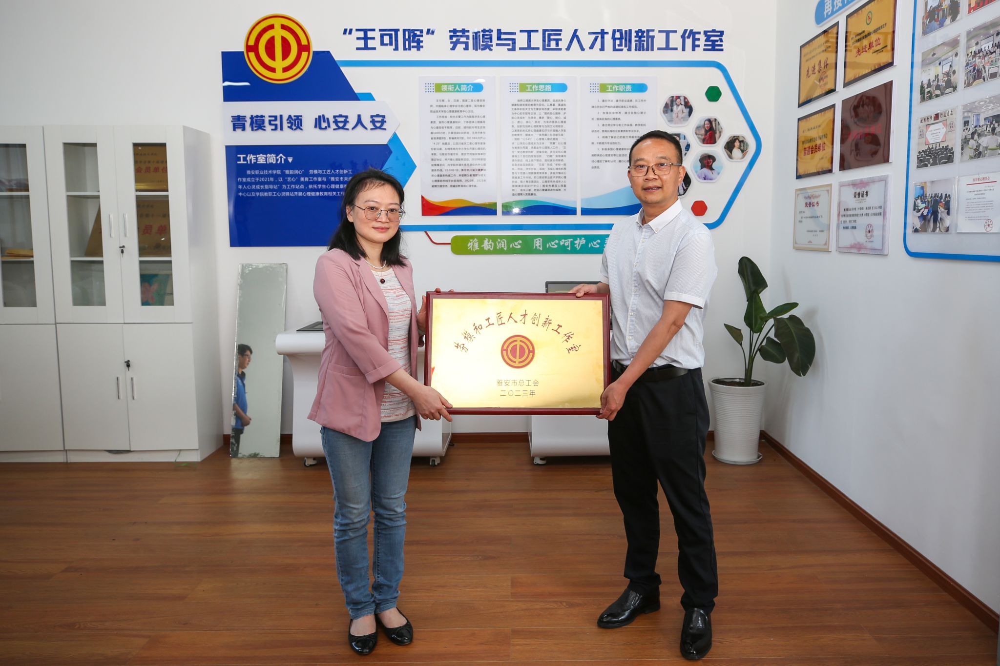 5月13日,雅安市总工会副主席陈曦一行来学校心理健康教育中心开展调研,并为王可晖劳模和工匠人才创新工作室授牌。学校党委常委、工会主席、宣传统战部部长夏安琼陪同调研。