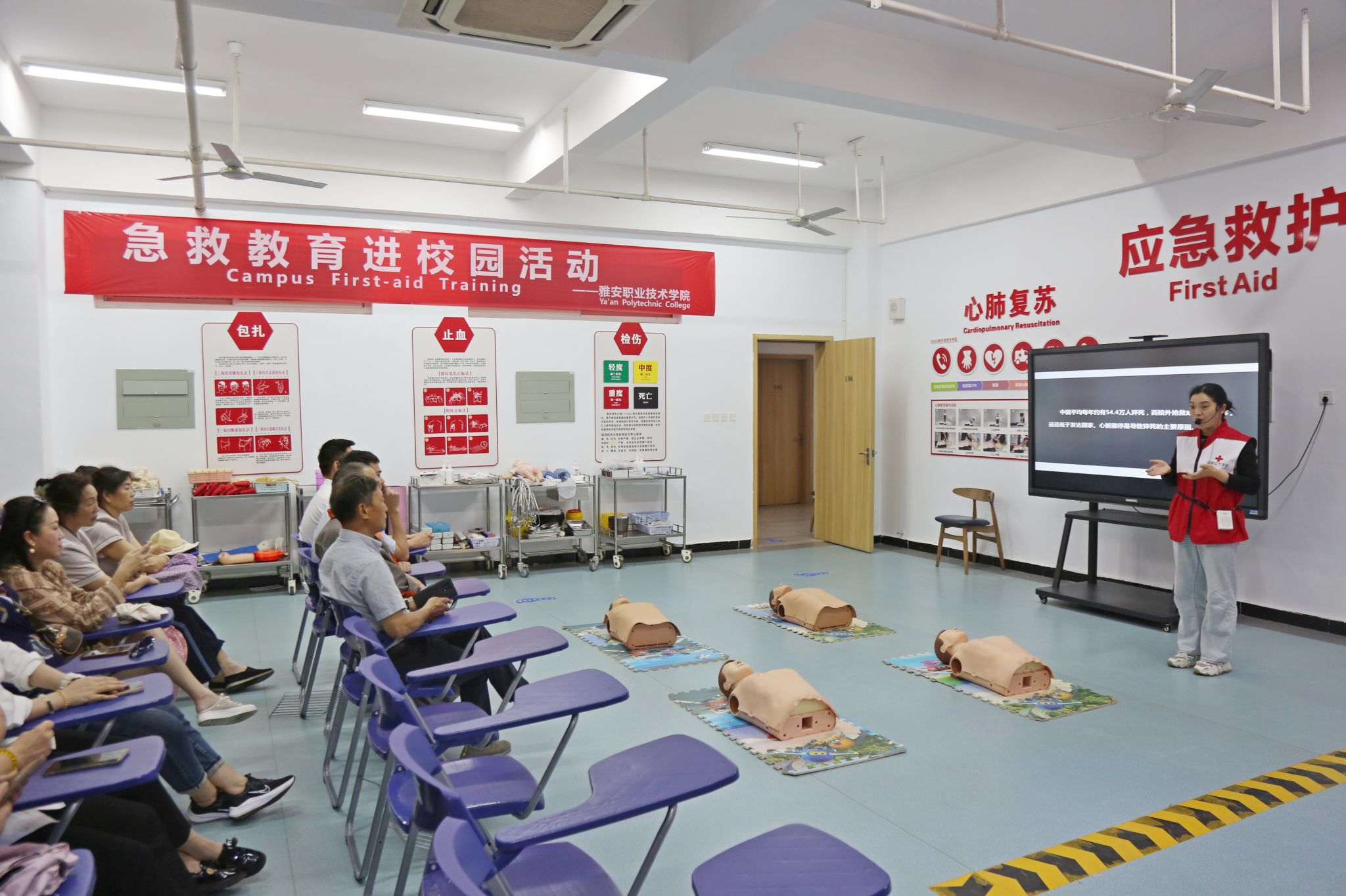 5月15日,护理学院在学校青年路校区红十字应急救护培训基地开展科普场馆开放活动,雨城区汉碑路社区居民、学校食堂人员60余人参加。
