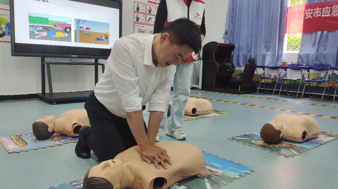 教师殷显艳现场给大家讲解关于包扎、心肺复苏的急救知识,以及各种突发场景受伤后的注意事项,现场演示救援方法,并让大家亲自动手操作体验学习。