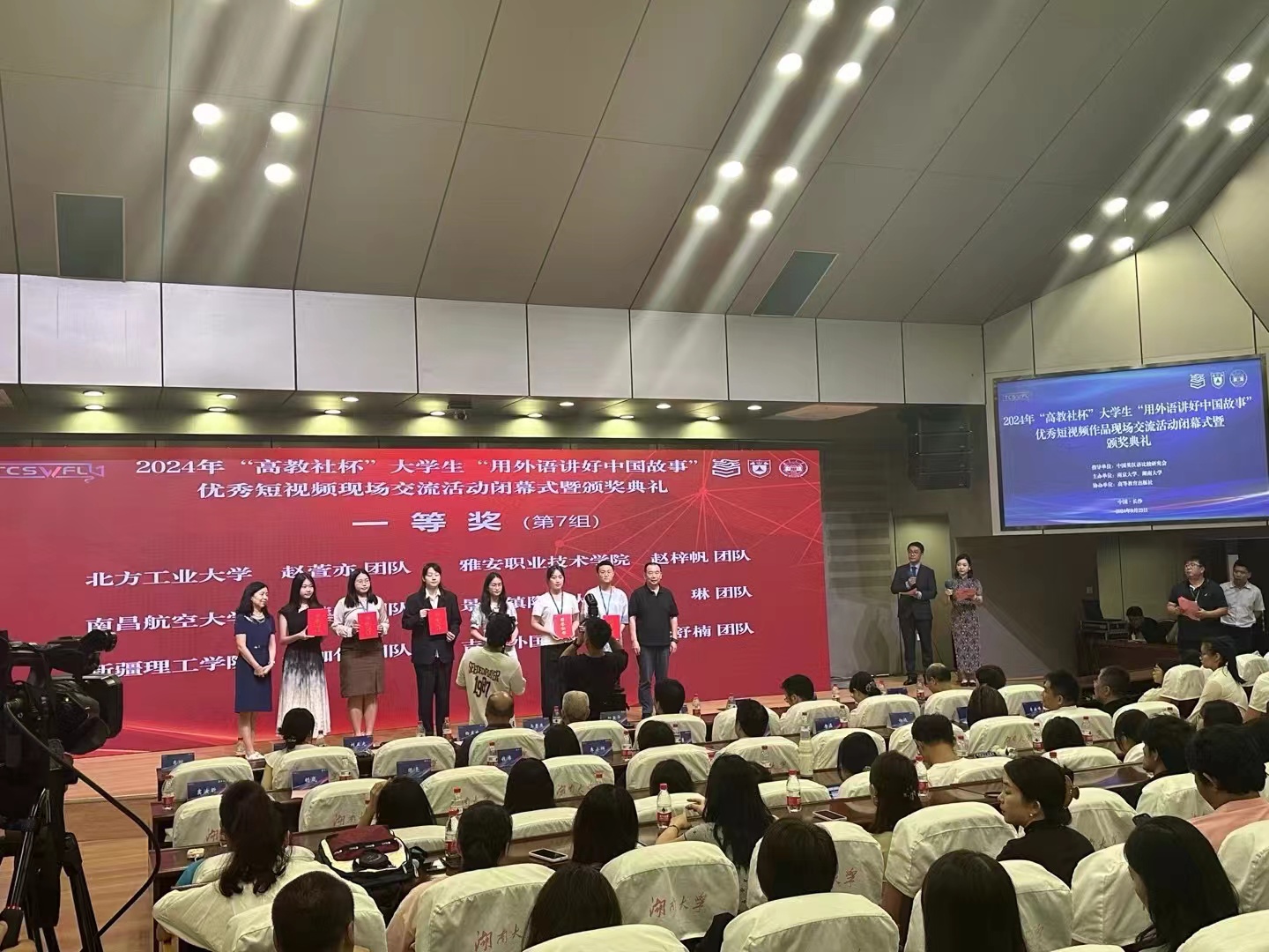 9月29日上午,2024年“高教社杯”大学生“用外语讲好中国故事”优秀短视频现场交流活动闭幕式暨颁奖典礼在湖南大学举行。由学校师范学院张莹、周婧悦两位老师指导,23级护理学(本科)唐佳琳、医学影像(本科)赵梓帆等五名同学组成的团队,凭借作品《芦山花灯》从全国赛本科赛道5052件参赛作品中脱颖而出,荣获一等奖。