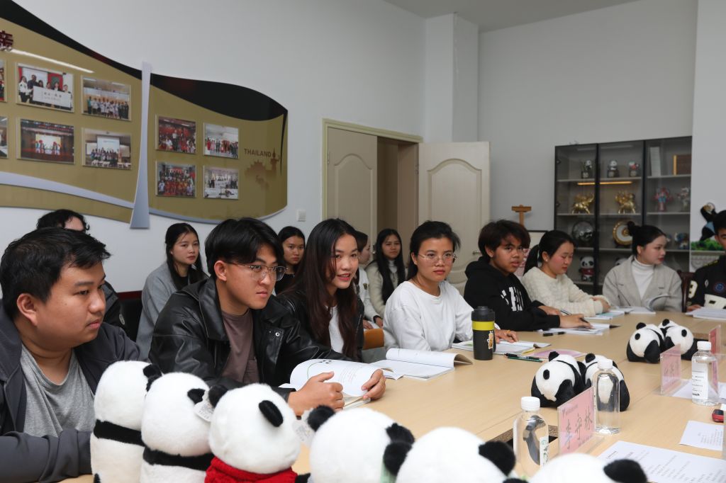3月25日下午,“以书为眸,共赴大熊猫文化之约”留学生读书分享会在学校青年路校区社区学院中泰文化艺术交流中心组织举行。学校党委常委、副校长付洪涛,发展规划处、继续教育与国际交流处、科技图书情报处、智能制造与信息工程学院、师范学院、经济与管理学院相关负责人、教师代表及来自泰国、老挝、尼泊尔、斯里兰卡、马尔代夫的30名留学生代表参加了本次读书分享会。