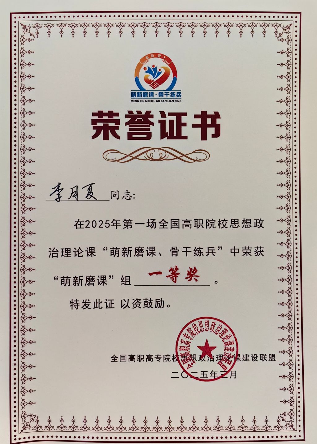 3月29日,由全国高职高专院校思想政治理论课建设联盟主办的2025年第一场全国高职院校思政课“萌新磨课·骨干练兵”教学展示活动在广西南宁圆满落幕,来自全国26个省、自治区、直辖市的150余所高职院校的校级领导、马克思主义学院负责人、思政课骨干教师和青年教师代表300余人参加了此次活动,现场展示同步在教育部集体备课平台全程进行线上直播。学校马克思主义学院教师李月夏荣获“萌新磨课”组一等奖。