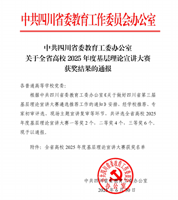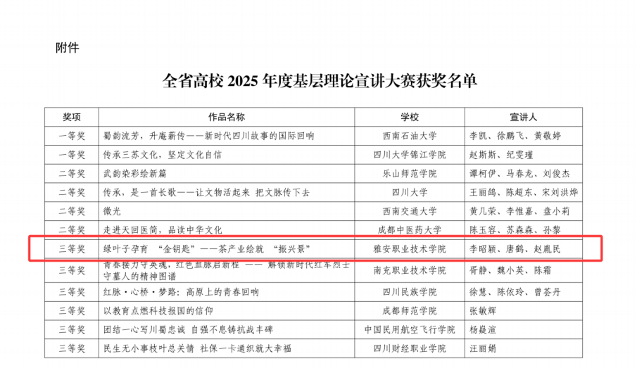 近日,四川省教育厅对全省高校2025年度基层理论宣讲大赛获奖结果进行通报,本次比赛共评出一等奖2个,二等奖4个,三等奖6个。beat365官网马克思主义学院教师李昭颖老师主讲的宣讲作品《绿叶子孕育“金钥匙”——茶产业绘就“振兴景”》获得三等奖。